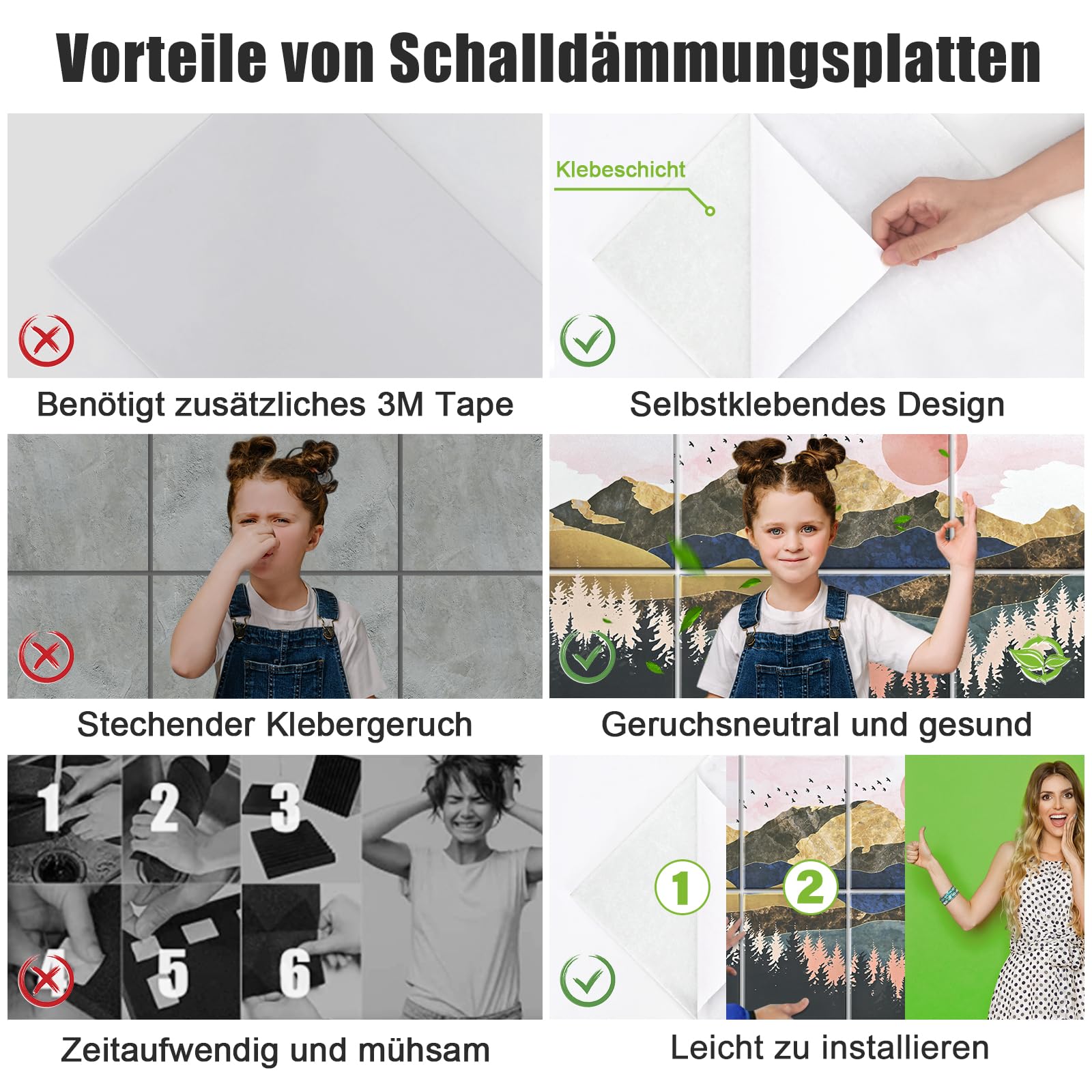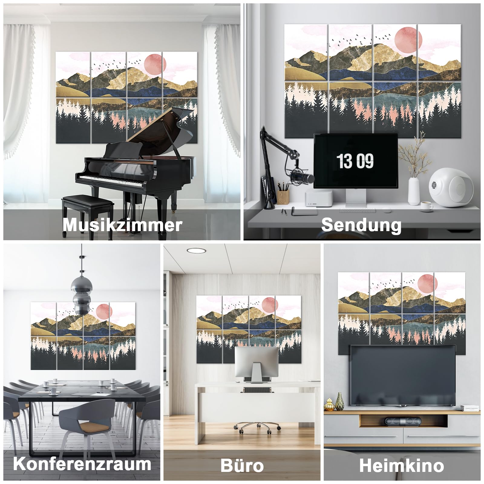 ["High Density Material: These 8 packs of acoustic panels are made from high-density polyester fiber material, ensuring a noise reduction coefficient of 0.92 and a sound absorption coefficient of 0.8. The soundproof acoustic panels are not only wear-resistant and scratch-resistant, they are also odorless, non-irritating, fire-resistant, safe to breathe and touch, providing you with a comfortable and quiet space","Mountain Trees Decor: Self-adhesive acoustic panels include 8 pieces of sound-absorbing panels measuring 30 x 40 cm each, with a total size of 80 x 120 cm, large enough to meet your acoustic treatment needs. The sound absorber panels are designed with mountain tree patterns, hanging on the wall like a decorative painting, not only can decorate your room, door, and ceiling, but also reduce noise and improve the sound environment and room quality","Excellent Sound Absorption: 9.7 lb/ft³ high-density sound-absorbing wall panels effectively absorb reverberation, unwanted acoustic reflections, unwanted noises, and reduce sound waves. They are great for playrooms, rehearsal rooms, concert halls, home theaters, and more. In addition to using acoustic panels for sound damping and improving a room's acoustics, they can also be used to decorate your room","Easy to Install: Self-adhesive acoustic panels have self-adhesive labels on the back, simply peel off the self-adhesive labels, no special tools or materials required, can be easily stuck to any smooth and clean surface. The acoustic panels can be securely attached to the wall without falling off. You can also design different adhesive patterns for the acoustic panels to create your own acoustic wall panels","Acoustic Panels Usage: Noise reduction acoustic panels are ideal for soundproofing walls in recording studios or offices, can be firmly attached to the wall, absorb sound waves and enhance soundproofing effects, suitable for home theaters, playrooms, rehearsal rooms, concert halls, etc., creating a private, quieter environment; they can also be used to decorate the door, ceiling, room, etc., a good choice for wall decorations and soundproofing"]