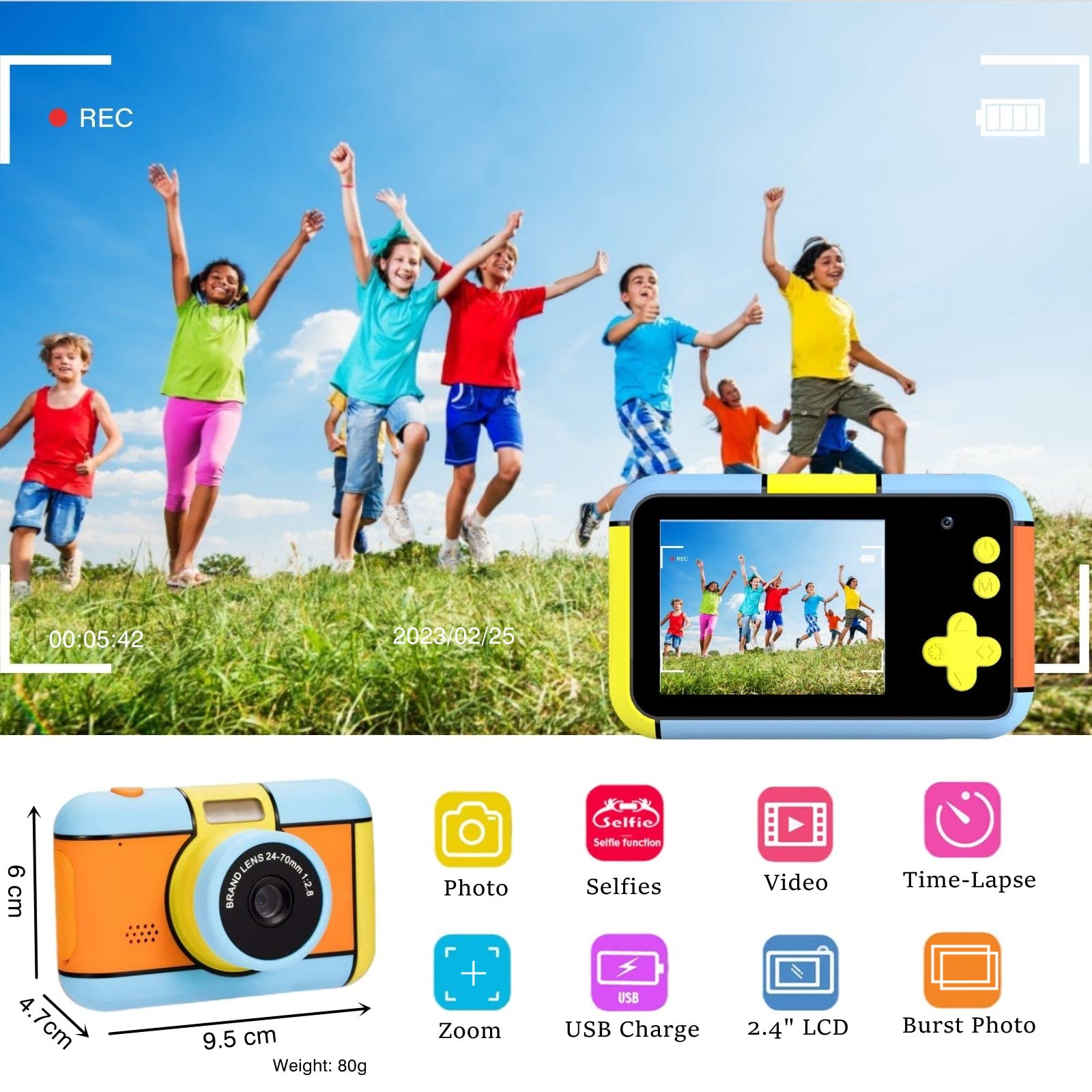 ["Children's Cameras"] 2.4-inch LCD screen, 1080P / 30fps HD video and 24MP photo. This children's camera has a dual lens, selfie mode, front and rear camera with 18.0 megapixels, greatly improved photo definition. With the CMOS image sensor, you can capture high-resolution photos and videos for children. An ideal starting point for boys or girls to cultivate photographic hobbies or improve photographic skills.