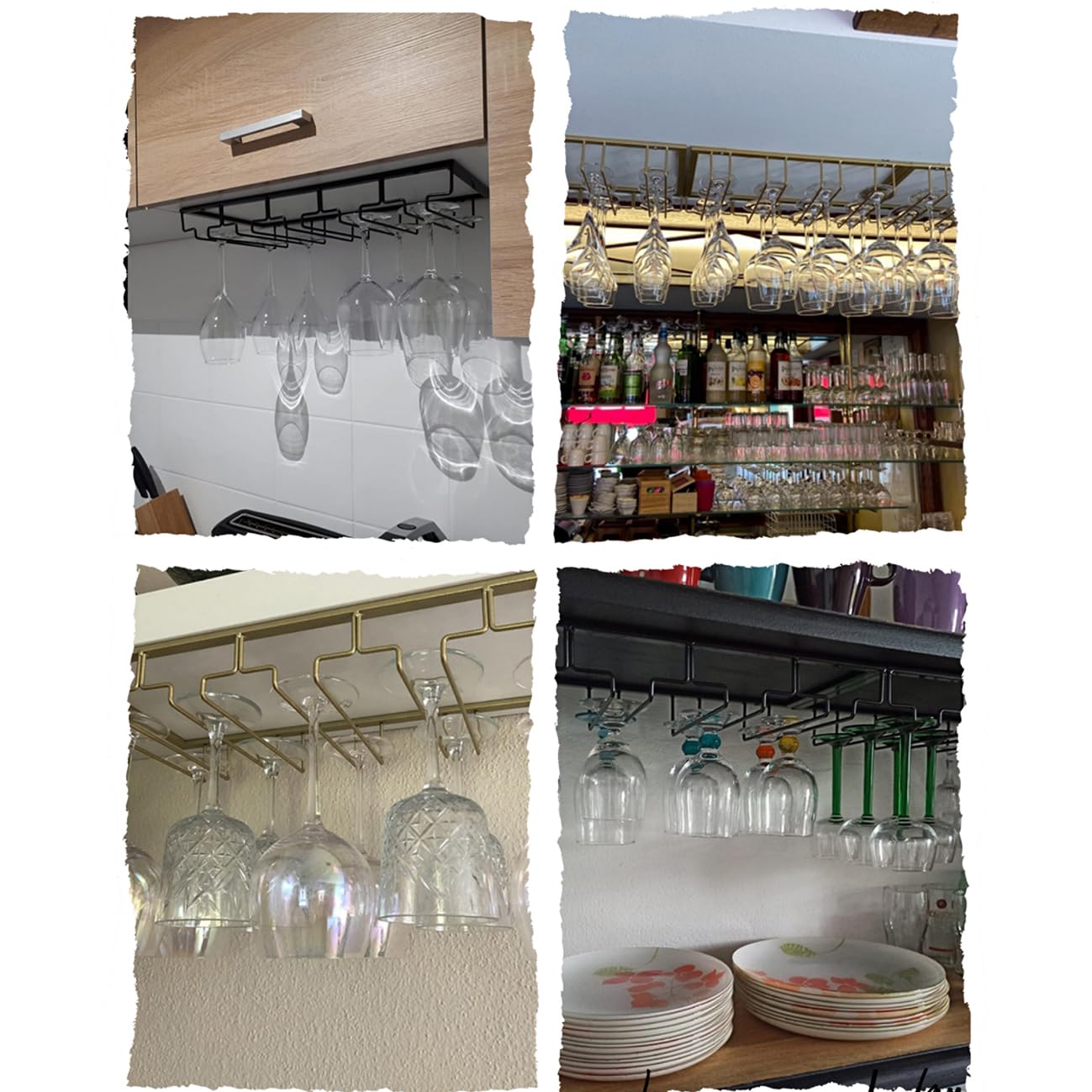 ["SUITABLE FOR MULTIPLE CUP TYPES: Depending on the size of the glass, each rack can easily hold up to 2 to 3 wine glasses and is suitable for a variety of cup types such as Bordeaux, champagne, cocktail glasses, etc. This wine glass rack also fits under most kitchen cabinets.", "SAVE SPACE AND DISPLAY YOUR GLASS: The contemporary appearance of the wine rack adds a touch of elegance to your kitchen or bar, perfect for showcasing your stemware.", "MATERIAL AND DURABILITY: Made of solid iron rod covered with a rust-proof coating, it is sturdy and guaranteed for long-term use.", "LOCATION: This wine glass rack is used under the cabinet. Depending on the size of your base cabinet, you can order 2 to 3 units.", "INSTALLATION: Installation is simple and straightforward. The rack comes fully assembled but needs to be installed. Screws are included for easy mounting."]