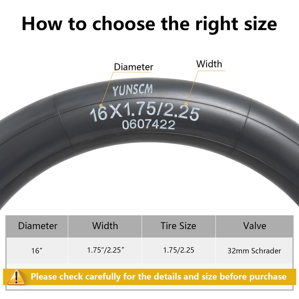 ["High Performance Inner Tube: 16 inches x 1.75 inches/2.25 inches AV33mm (45/57-305) high performance bicycle replacement inner tube, these inner tubes are very suitable for a wide range of applications. Improved the expandability of high-performance tires, expanding their range of use, compatible with 16x1.75, 16x1.90, 16x1.99, 16x2.0, 16x2.10, 16x2.125, 16x2.20, 16x2.25 tires.","Excellent shock absorption capability: The sturdy and highly durable butyl rubber made from these tubes is a perfect shock absorber, reducing vibrations and eliminating shocks caused by road or ground irregularities and rough surfaces. Heavy duty butyl rubber provides maximum ride comfort and enhances your riding experience.","Airtightness: High elasticity and high-quality butyl rubber and EPDM rubber are used, with a thickness increase of 40%. The airtightness of the inner tube is 200% higher than that of ordinary butyl tubes; After inflation, the tire can maintain high air pressure, greatly reducing the inflation frequency. Good airtightness helps maintain a stable tire pressure and thereby improve driving safety.","Heavy duty tube ultra durable: Our heavy-duty tube has higher puncture resistance than ordinary tubes, and the thicker body can withstand more friction and wear, extending the life of the tube, reducing replacement frequency and maintenance costs. Long-term use.","This heavy-duty tube is compatible with corresponding models of mountain bikes, road bikes, off-road bikes, and electric bikes; Meanwhile, the increase in thickness can meet the longer range and load requirements of current electric bicycles.","Installation: 16 inch x 1.75 inch/2.25 inch bicycle high performance replacement inner tube, easy to install and remove. Position of the check valve to ensure correct installation direction."]