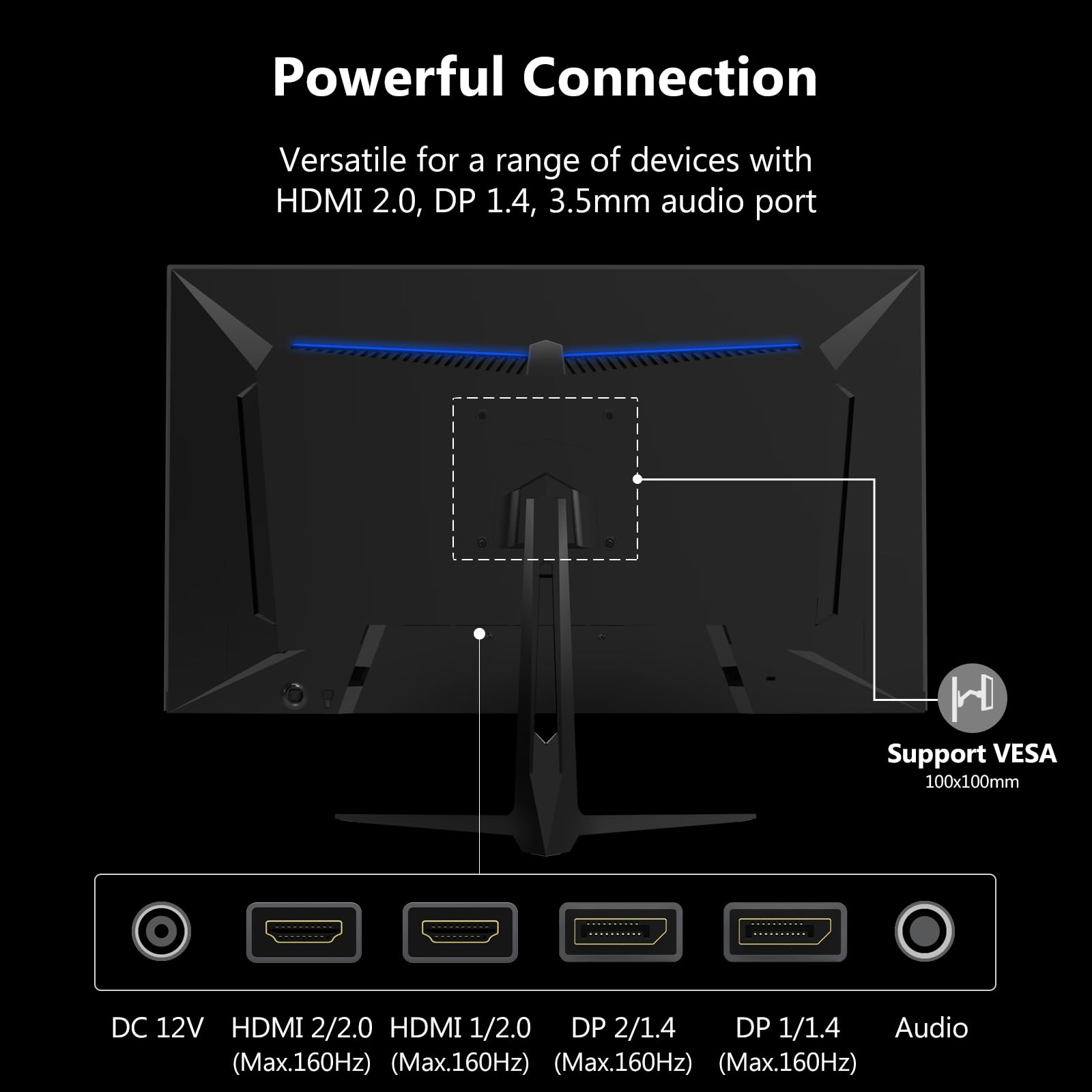 ["4K UHD Monitor - With a 4K resolution of 3840x2160, the 27-inch monitor delivers incredibly stunning and lifelike images, allowing you to capture perfect details. With HDR10 and 1.07 billion colors, the monitor provides brilliant image quality, allowing you to easily recognize every detail even in the darkest or brightest scenes.","Revolutionize Your Gaming Experience - Enjoy ultra-smooth gameplay, faster image reproduction, and lower input lag with a fast refresh rate of up to 160Hz and a response time of 1ms. The FreeSync technology can eliminate screen tearing, stuttering, and input lag, providing you with an exceptional gaming experience.","Premium IPS Panel - With the high-end IPS panel, the monitor further enlarges the viewing angle and offers a wide viewing angle of 178º, making it easier to share work or content. The IPS panel ensures consistently accurate and vibrant colors of videos and images from all viewing angles.","Powerful Connectivity - Equipped with two HDMI and two DisplayPort input ports, you can connect multiple devices to the monitor for multitasking. All ports support up to 160Hz. You can connect your speaker or headphones through the 3.5mm audio output.","Ultra-slim Frame Design - Makes the monitor almost frameless, providing a wider field of view and a better immersive feeling. When combined with additional monitors, they can make multi-monitor setups nearly borderless. It is also VESA-compatible for wall mounting."]