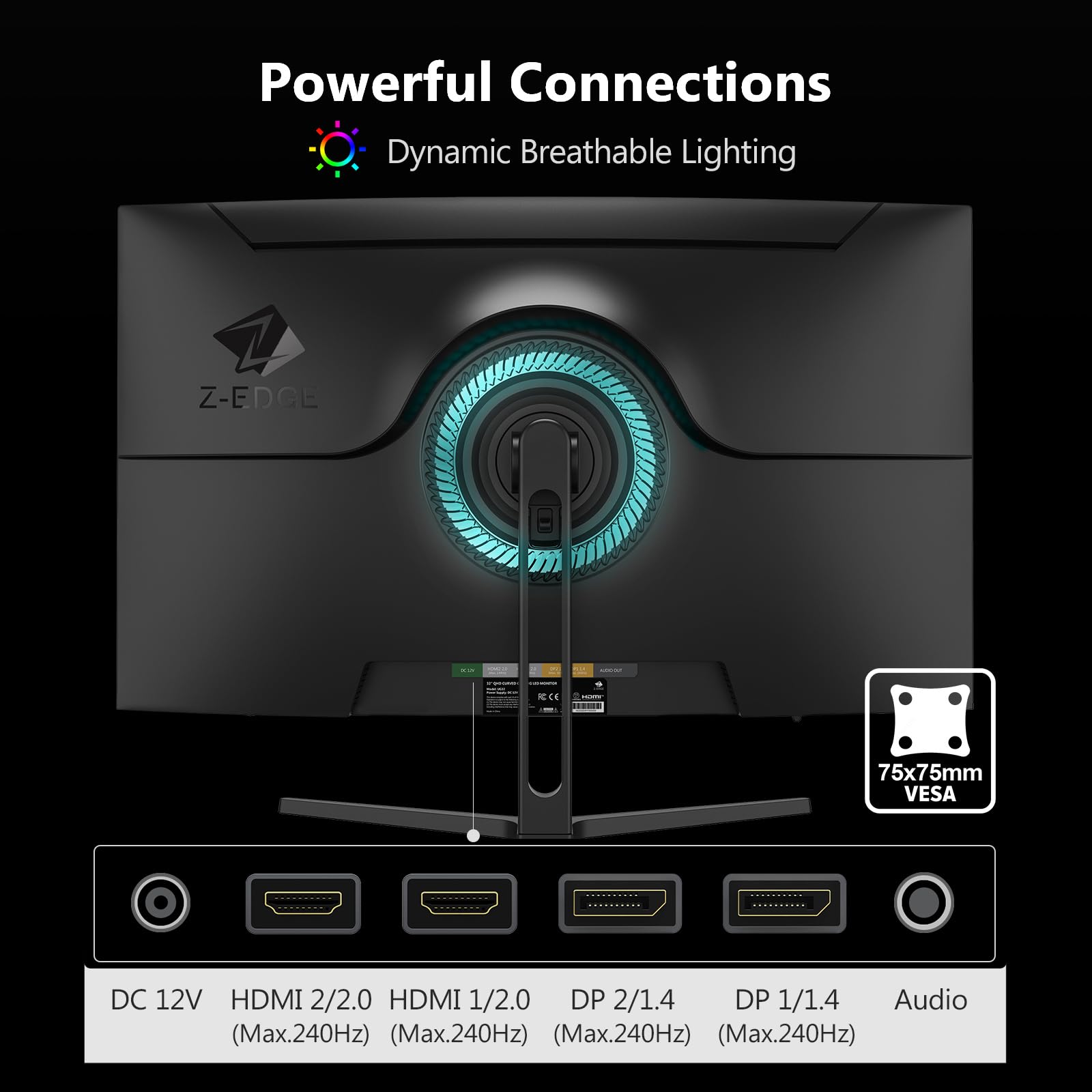 Z-Edge 32-inch Curved Gaming Monitor with 240Hz 1ms MPRT Full HD LED display, 16:9 1500R curved screen, 280cd/m² brightness, Freesync, DisplayPort 1.4 & HDMI 2.0.