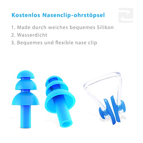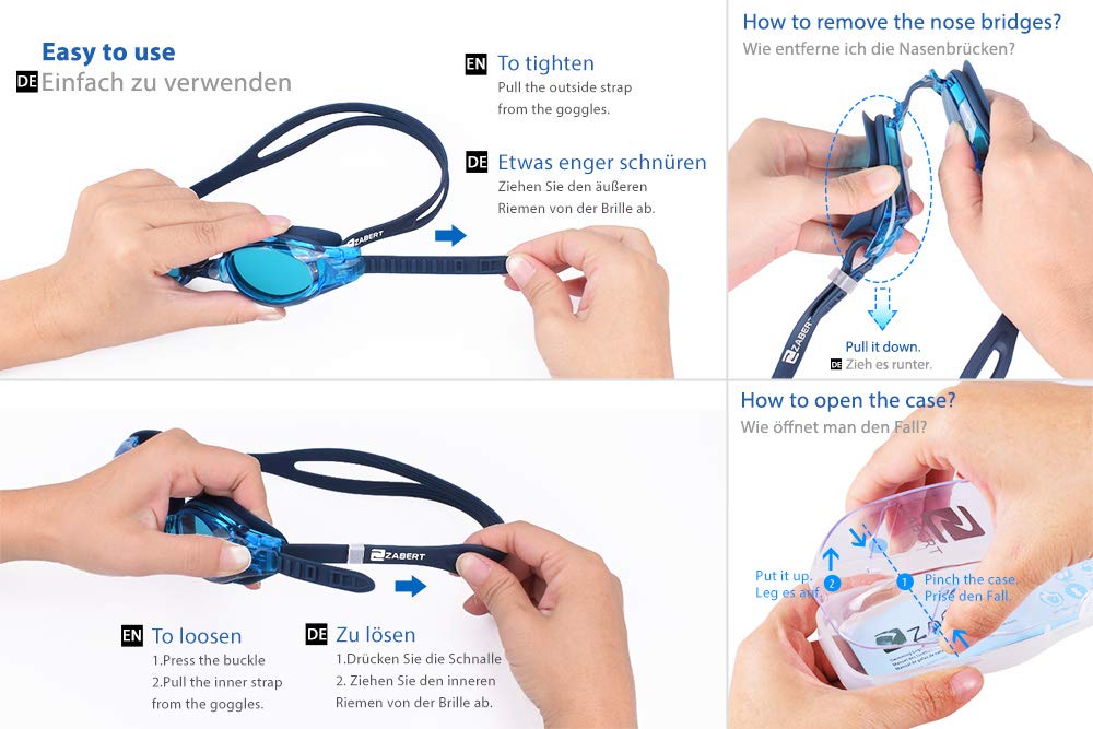 ["Pro Anti-fog Technology Swim Goggles - 2020 Updated Version Optimized and durable ZSAC+ fog protection coating through hardening. Not the cheap coating, won't harm your body baby. Award winner! Best anti-fog adult swim goggles under $30. Yes! Best anti-fog swim goggles under $30!", "180°+ Wide-angle, flat panoramic lens. UV Protection - sun protection for swim goggles, 100% UVA and UVB protection. So you can see clearly at all times! This is the good swim goggles you wanted. Whether you swim outdoors/indoors/pool/triathlon/competition, you will be able to enjoy every moment with absolute clarity. Clear/tinted/mirrored lens.", "No leaking and comfort - Customized 3D swim goggles with ergonomic design for Europeans, good fit, no leaking, better comfort; The perfect size adult swim goggles for ladies men men women women youth boys girls kids aged 10 and above. Best CE, BS 5883, SGS & ISO9001 approved Safe healthy comfortable materials. PVC free. No chemical odor, not cheaply made.", "Size of the ZABERT W5 adult swim goggles - The flexible nose bridge in 3 different sizes (S/M/L) fits most Europeans. The ZABERT W5 swim goggles are designed for adults, ladies, men, kids aged 10 and above. Classic automatic buckle. Easy to adjust, smooth and durable. What's in the package? The ZABERT W5 swim goggles * 1, nose bridge * 3, swim goggles case * 1, free nose clip * 1 and earplugs * 2.", "Excellent Service - TOP friendly customer service! Great gift ideas for adult ladies or men. Brand new and fully authorized product. Please order with confidence. Have fun swimming!"]