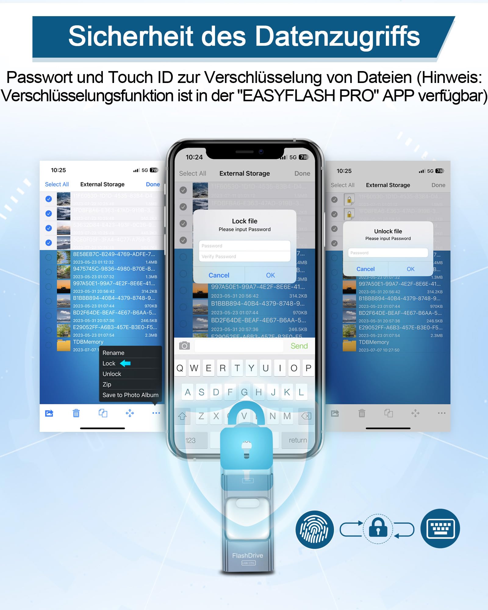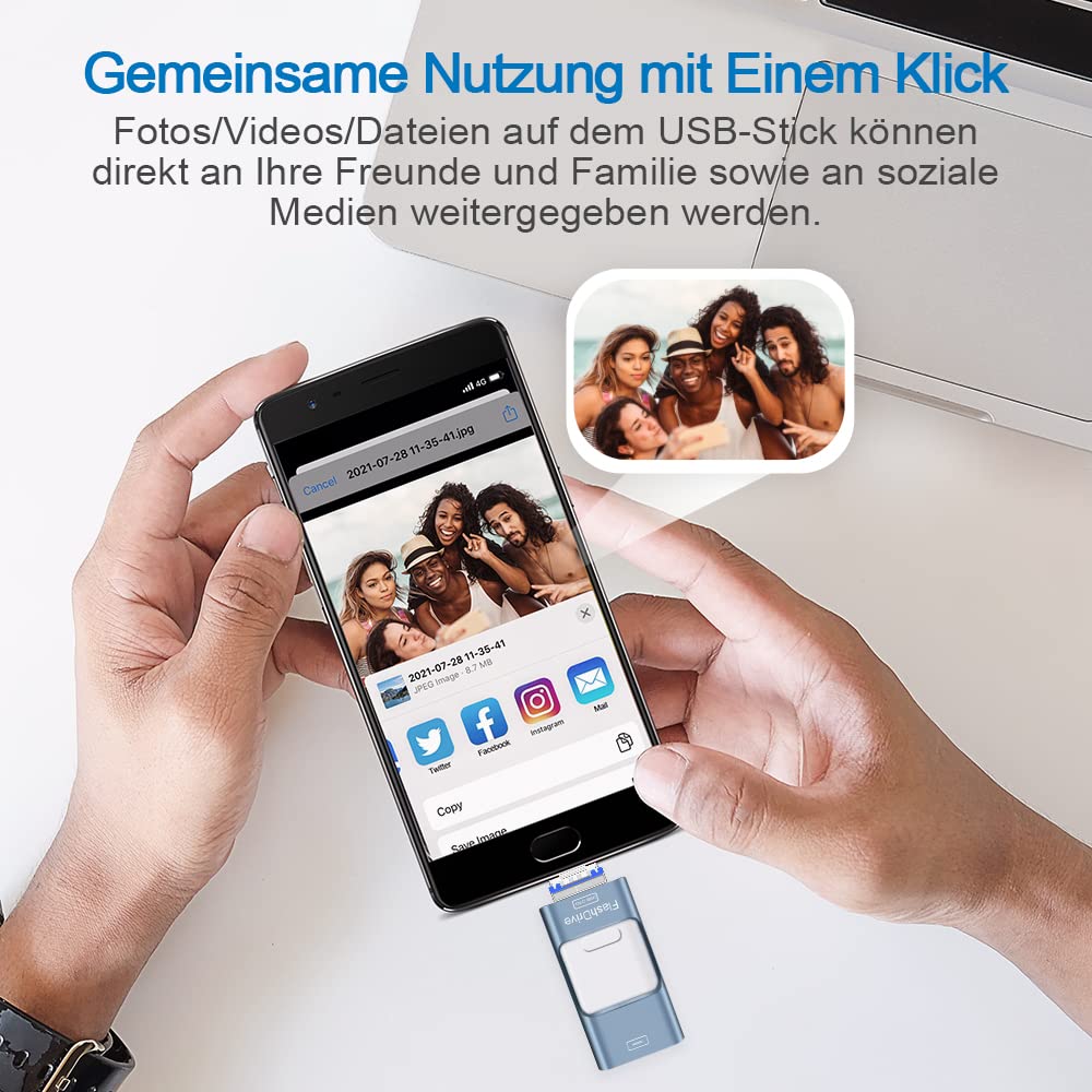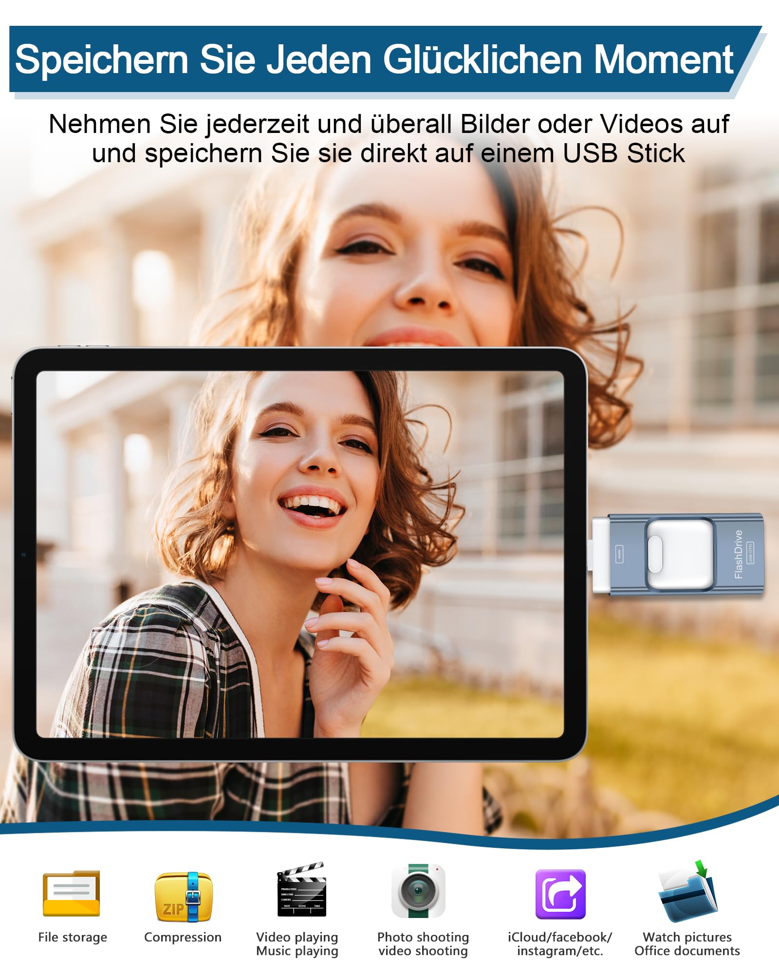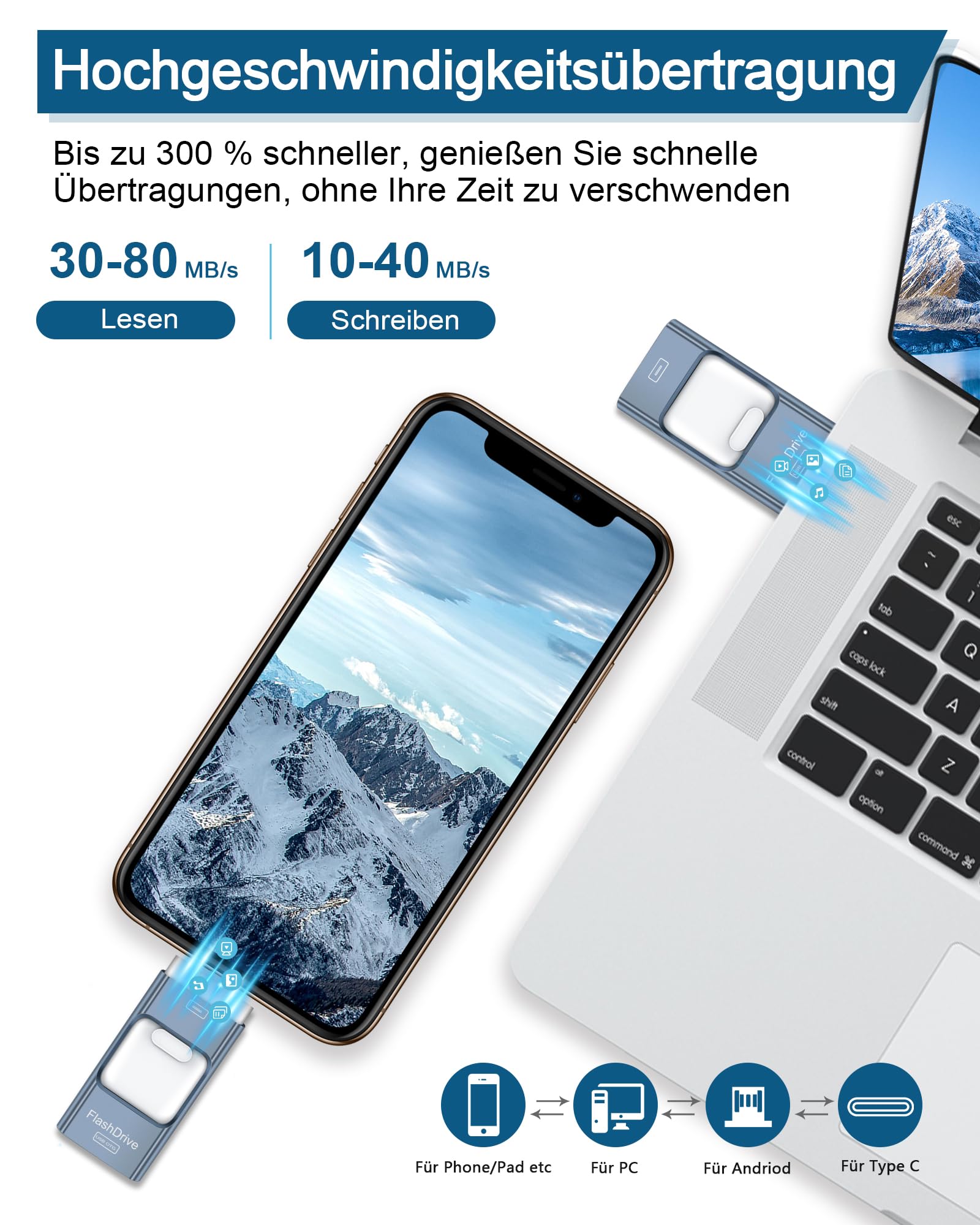 ["4-in-1 USB Stick - Facilitates file transfer: iOS port + Android port + Type C / USB C + USB 3.0 and can be used for phone / iOS devices / Android / PC. ZARMST USB Memory Stick supports major video and music formats, allowing you to play movies and listen to music directly from the 256gb memory stick.","Password protection - Security for data storage: Password and Touch ID can encrypt file information in the APP to protect your private files. You can choose whether to encrypt the entire USB flash drive or a specific file. Don't worry about others stealing your files.","High-speed and One-Click Backup: USB 3.0 sticks experience up to 80 MB/s read and 40 MB/s write speeds, and photos, videos, and documents can be backed up with one click on the USB flash drive. Quickly free up storage space on your device, save your time. ZARMST USB stick, it's that simple to create more storage space.","Watch videos directly and share on social media: Plug-and-Play, you can watch the movie directly on the USB stick for phone. You can also share your photos directly from your USB C stick on social media when you take beautiful photos during your trip.","Multi-Port Support for Multiple Devices: ZARMST USB stick is generally used for storage, data backup, and file transfer, which can meet your daily needs for image, video, music, file storage. To use USB flash drives on iOS, you need to download the “EASYFLASH PRO” app; Android does not need to download an app, just activate the OTG function."]