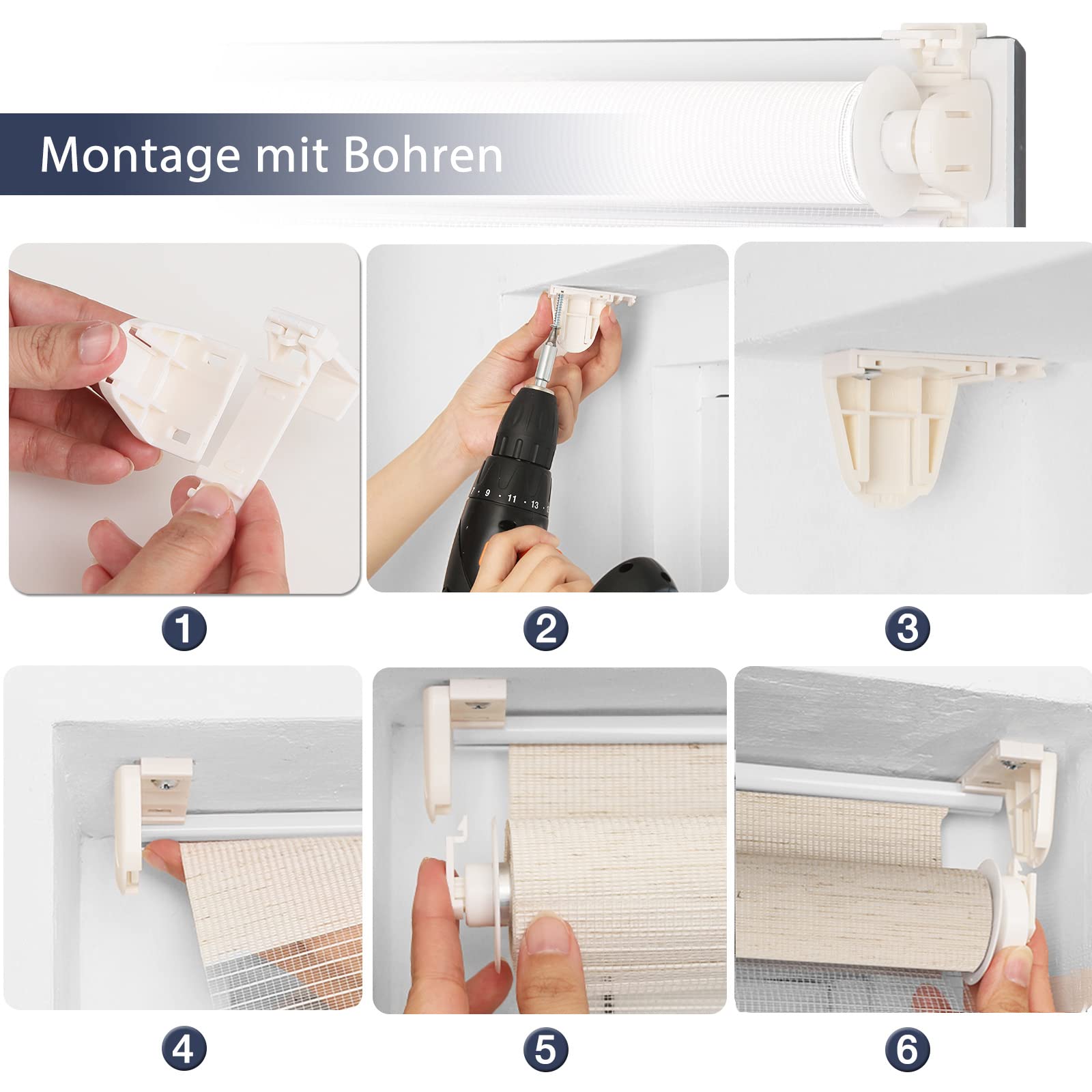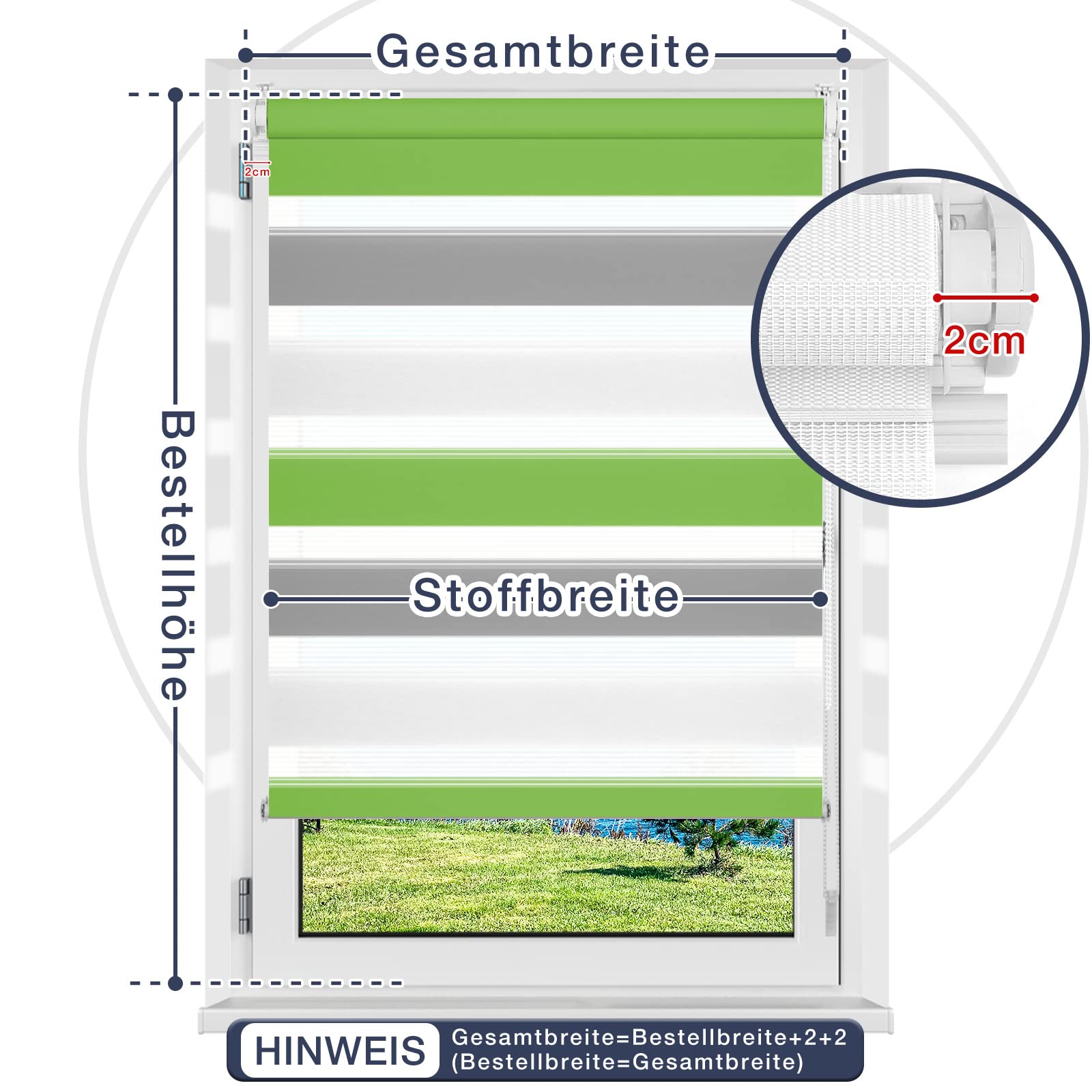 ["Kingderleicht Montage: The double roller blind Klemmfix does not require any annoying pre-assembly and is almost completely assembled. You can mount the double roller blinds without drilling, using Klemmfix brackets directly on the window frame, which can be individually adjusted to fit frame widths of 15-23mm. Wall mounting for drilling is also possible, and with the supplied accessories, you can freely decide how to mount the window blind. The entire installation takes about 10 minutes.","Schutzdesign & dekorativem Anspruch: The double roller blind without drilling looks very elegant. By alternating transparent and opaque fabric bands with the chain control, the double roller blind controls the light needs, brighter/darker; protects your privacy, blocks UV rays, and creates enchanting fascinating light patterns. The operating chain can be installed on the left or right, and the pull cord works silently.","Material: The fabric of the duo roller blind is laser-cut, reducing lint and wear after long-term use; and the fabric of the blind is made of 100% polyester, making it moisture wipeable; suitable for use in wet rooms as well; making the double roller blind suitable for all rooms: bathrooms, kitchens, living rooms, offices, conference rooms, hotels, cafes, etc.","Right Measurement: The fabric width is about 4-5cm narrower than the ordered width. Example: If your window pane is 30cm wide, please add at least 2cm to each side to completely cover the window pane, then add 4cm (mounting set measurement) to get the ordered width of 38cm. Choose the next size up 40cm wide.","Liefumfang & Kundenservice: Lieferumfang: 1x double roller blind, 1x mounting set Kundenservice: please contact us with any questions; In accordance with Amazon's new regulations, we have adjusted the display of size information. If you want to buy a double roller blind with a width of 40cm and a length of 120cm, please choose the dimensions: W40 x H120cm."]