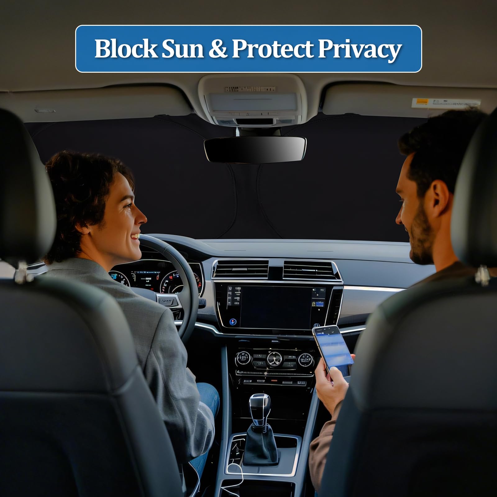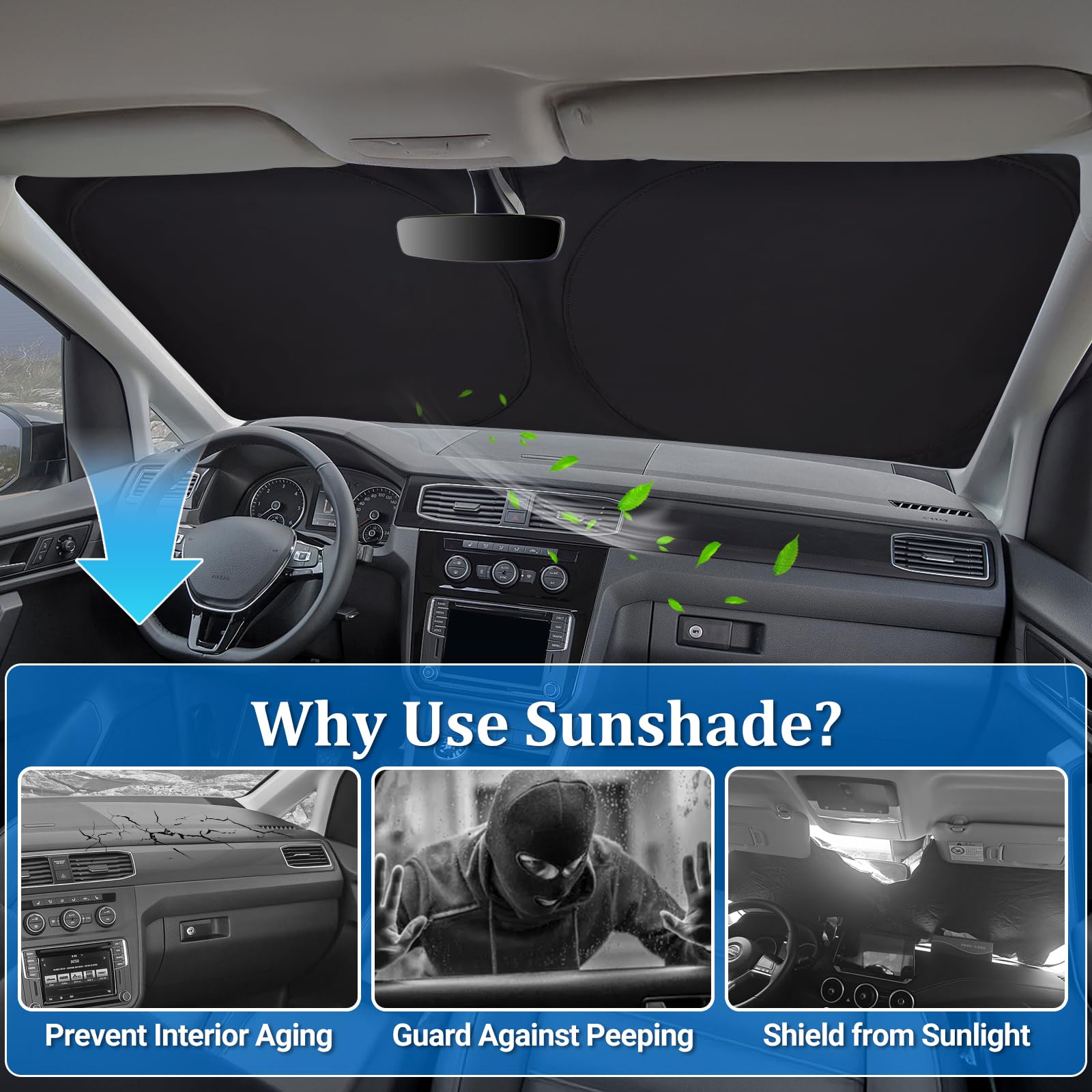 ["Double Layer & Thickened Material"] The sunshade for the car windshield interior is made of 210D nylon fabric with UV-reflective material. The two-layer thermal insulation reduces heat and blocks harmful UV rays. Prevents cracking and fading of the car interior.