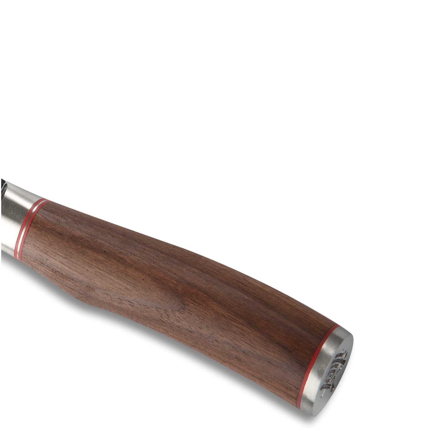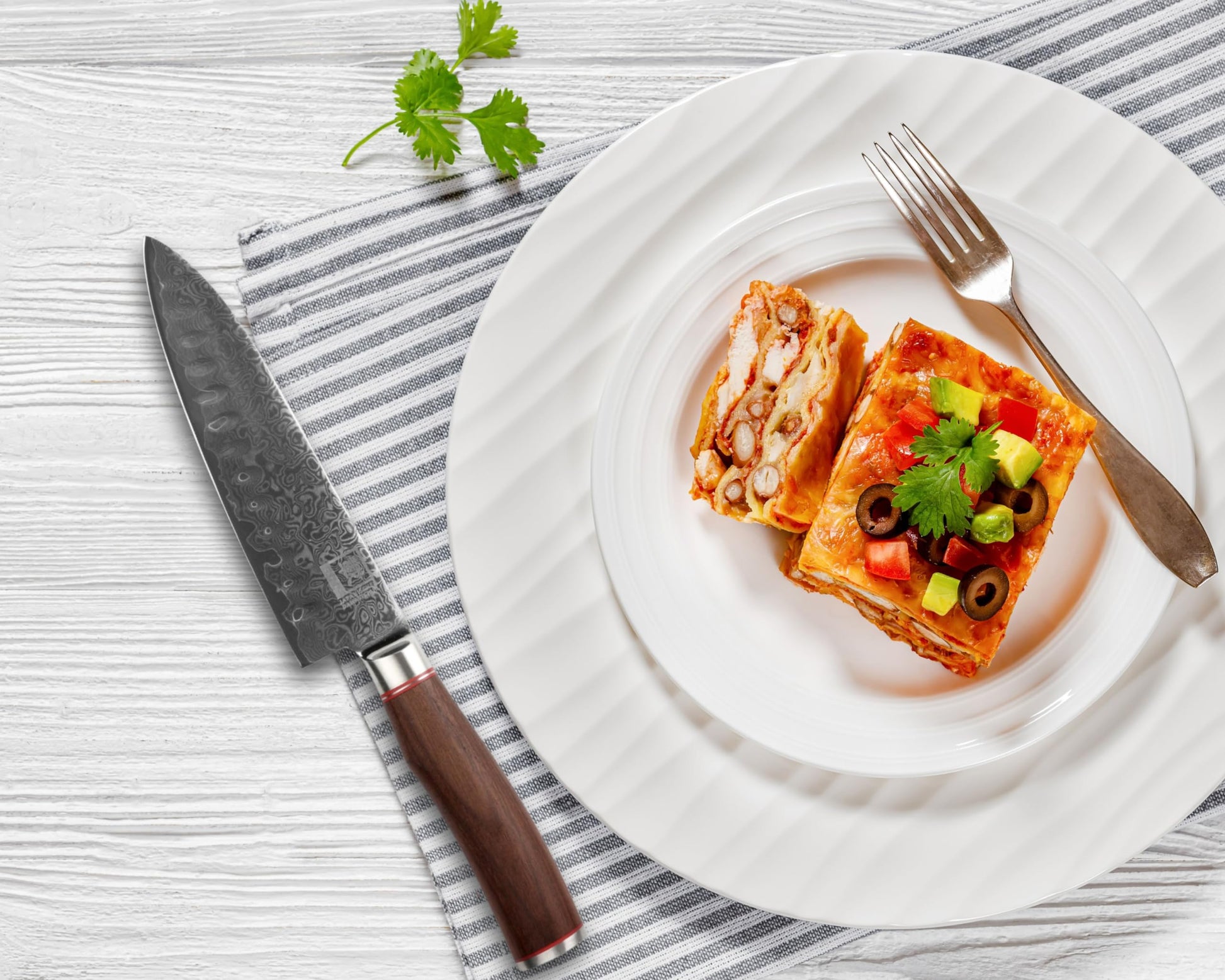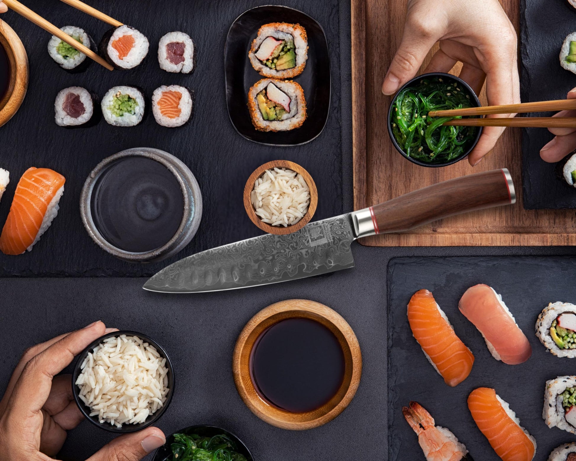 ["Knife Properties - The professional Santoku knife with walnut handle has a total length of 12 inches and a blade length of 7 inches. This sharp kitchen knife is ideal for precise and versatile cutting tasks. Whether you're cutting vegetables, meat, or herbs, this Damascus kitchen knife provides perfect balance and control for any task in the kitchen. With this high-quality chef's knife, all cutting tasks are effortless and precise.", "RAZOR-SHARP - The blade of the zayiko Kurumi Santoku knife is made of 67 layers of genuine Damascus steel, ensuring exceptional sharpness and durability. This professional knife is an essential tool in any kitchen, ensuring that every cutting task, whether in a professional kitchen or at home, becomes an effortless experience. The Damascus knife offers the highest quality and durability, ideal for daily use.", "ERGONOMIC HANDLE - The handle made of noble walnut wood not only offers outstanding aesthetics but also maximum comfort and safety. The ergonomic shape of this kitchen knife ensures fatigue-free work, even during longer preparations. This sharp chef's knife fits perfectly in hand and provides excellent handling due to the high-quality walnut handle. A professional knife for ultimate comfort in the kitchen.", "EVERY KNIFE A UNIQUE PIECE: The zayiko Kurumi Santoku knife is a true professional knife that impresses with its precise craftsmanship and extreme sharpness. This Damascus kitchen knife is perfect for cutting meat, fish, and vegetables. A sharp kitchen knife that should not be missing in any kitchen and impresses with its ergonomic shape and high-quality material. A knife for the highest demands and daily use.", "PERFECT AS A GIFT - The zayiko Kurumi Santoku knife comes in an elegant wooden box, guaranteeing not only safe storage of the knife but also making it an ideal gift for discerning chefs and connoisseurs. This high-quality packaging emphasizes the exclusivity of this Damascus knife and makes it a perfect gift. A sharp kitchen knife that impresses with its elegant presentation."]