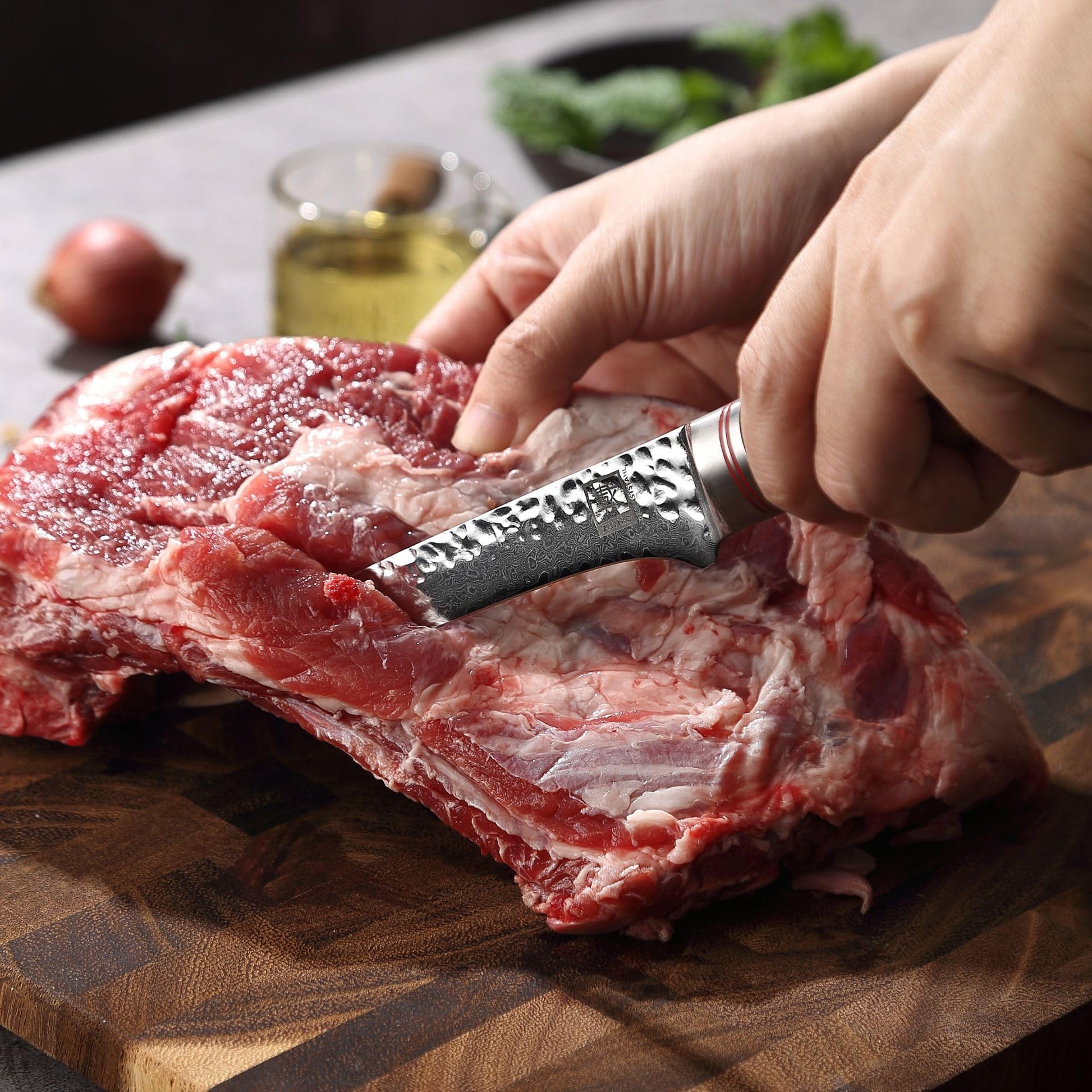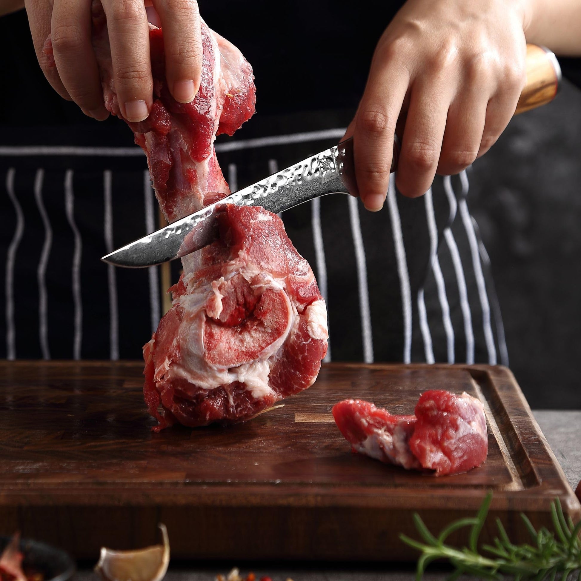 Zayiko Minami Olive Damascus Fillet Knife 6.5" Blade | 67-layer Damascus steel with hammered finish | Professional kitchen knife with flexible olive wood handle for precise filleting.