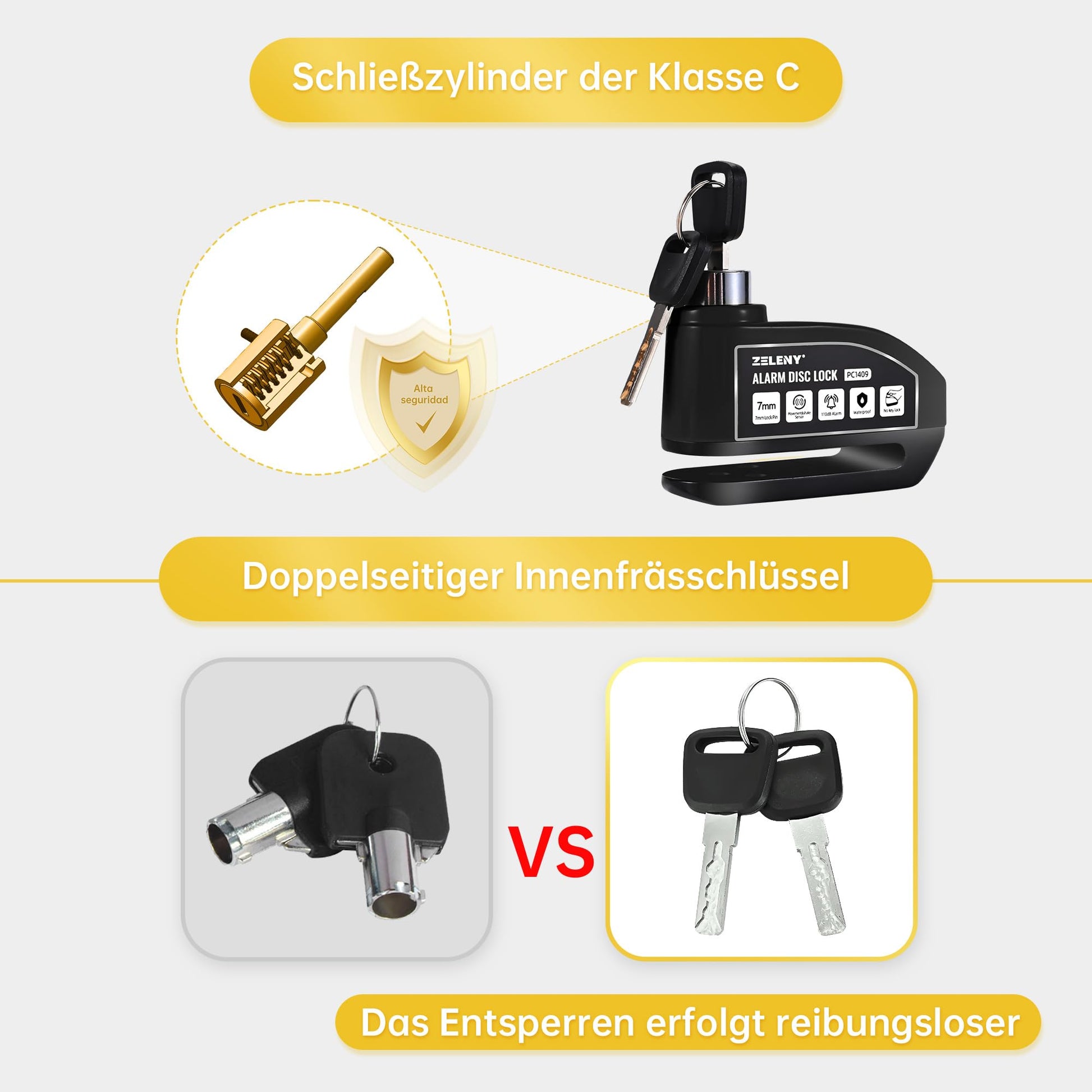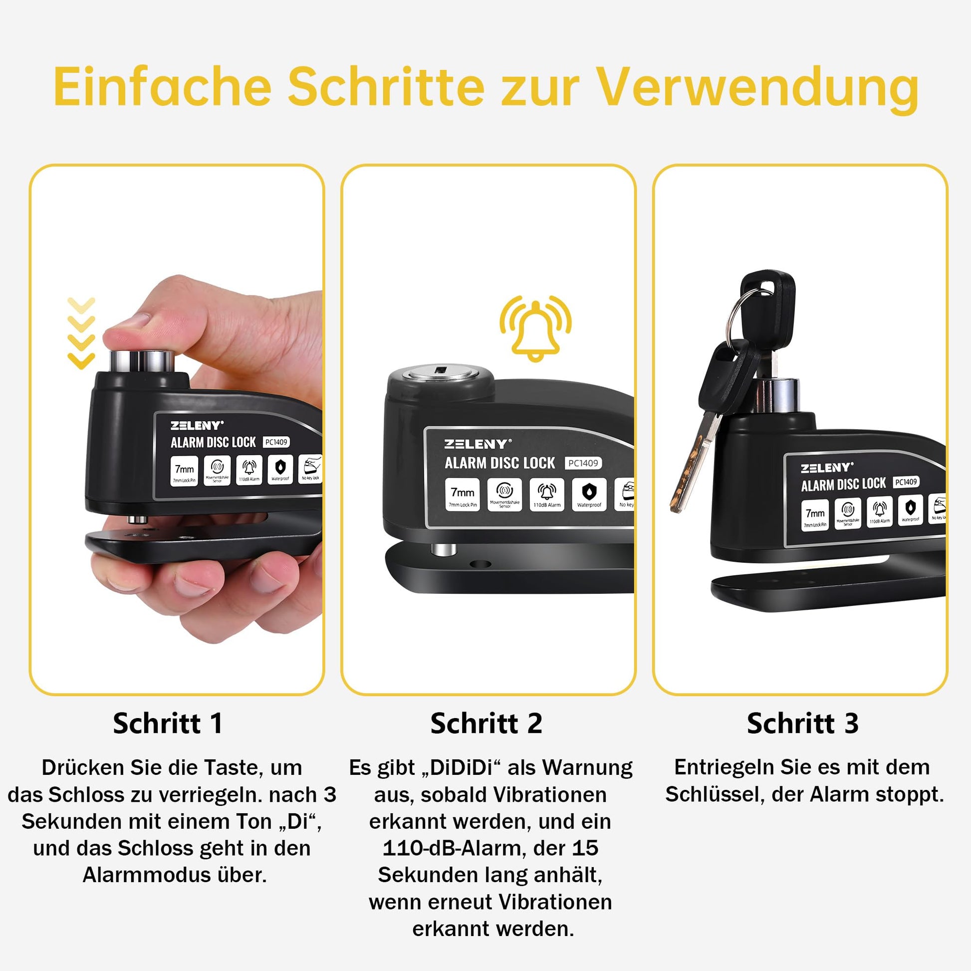 ["Reliable Theft Protection: The motorcycle lock with alarm features a built-in sensitive motion sensor that emits three \"DiDiDi\" warning tones when vibration or movement is detected. If continuous vibration or movement is detected, an alarm with 110 decibels will sound for 15 seconds, loud enough to attract attention and deter thieves attempting to steal or move the vehicle.","Sturdy Lock Cylinder: The cylinder of this disc brake lock is made of strong zinc alloy, which is not easily damaged. The motorcycle lock has a self-developed lock cylinder and a specially designed key, providing better security performance than other ordinary round hole keys. The lock cylinder is dust and waterproof and can function well under various weather conditions.","Easy to Use: This motorcycle disc brake lock is easy to operate and can be locked without a key. Pressing the lock cylinder will emit a beep, and after three seconds another beep will sound, indicating that the motorcycle disc brake lock is in alarm mode. It is also easy to transport with a carrying case that can be attached to the handlebars, allowing you to store the motorcycle lock while riding.","Durable & Long-lasting: ZELENY disc brake lock comes with 6 built-in LR44 batteries and an additional 6 spare batteries, supporting the alarm for up to a year of normal use. This motorcycle lock is overall strong and well sealed, capable of withstanding various levels of collisions. It is a great companion for your vehicle.","Wide Application: This disc brake lock with alarm is suitable for all vehicles with disc brakes. The locking pin has a diameter of 7 mm and works on most motorcycles, bicycles, mopeds, and e-bikes. It comes with an orange reminder cord to remind you to remove the lock before riding."]