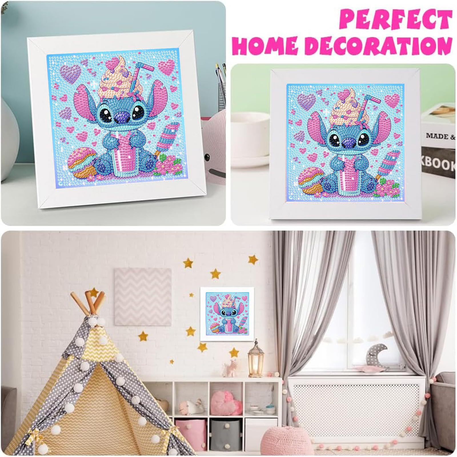 【HIGH QUALITY AND SAFE MATERIAL】 Our Stitch Diamond Painting Set for kids is made of environmentally friendly materials that are non-toxic and odorless. The high-resolution canvas is waterproof and has a uniform texture. The 5D sparkling acrylic diamonds make the painting more three-dimensional. The canvas itself has a self-adhesive surface that easily fixes the diamonds, making the entire diamond painting more stable. Provided with a wooden frame, it can stand as a perfect decoration on the table or hang on the wall.