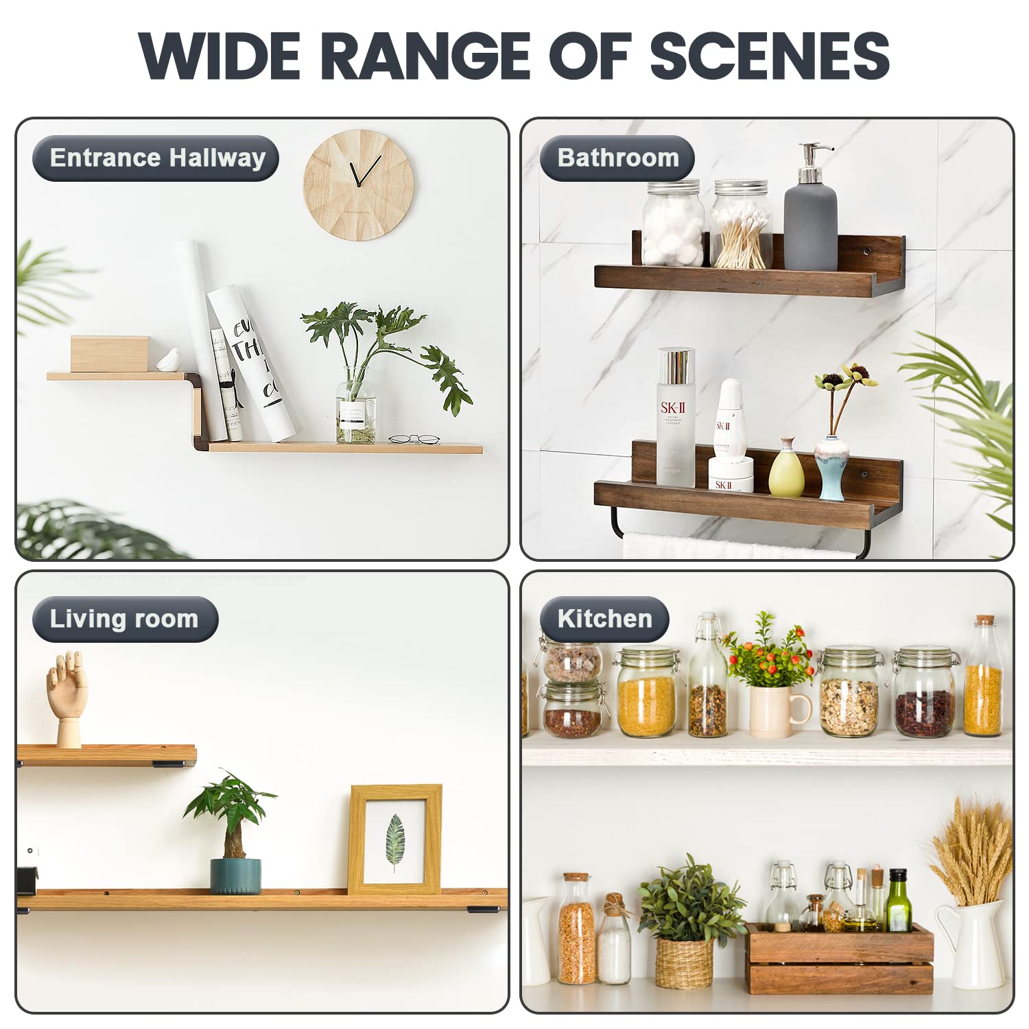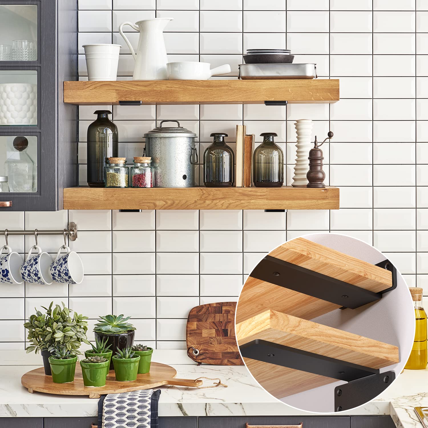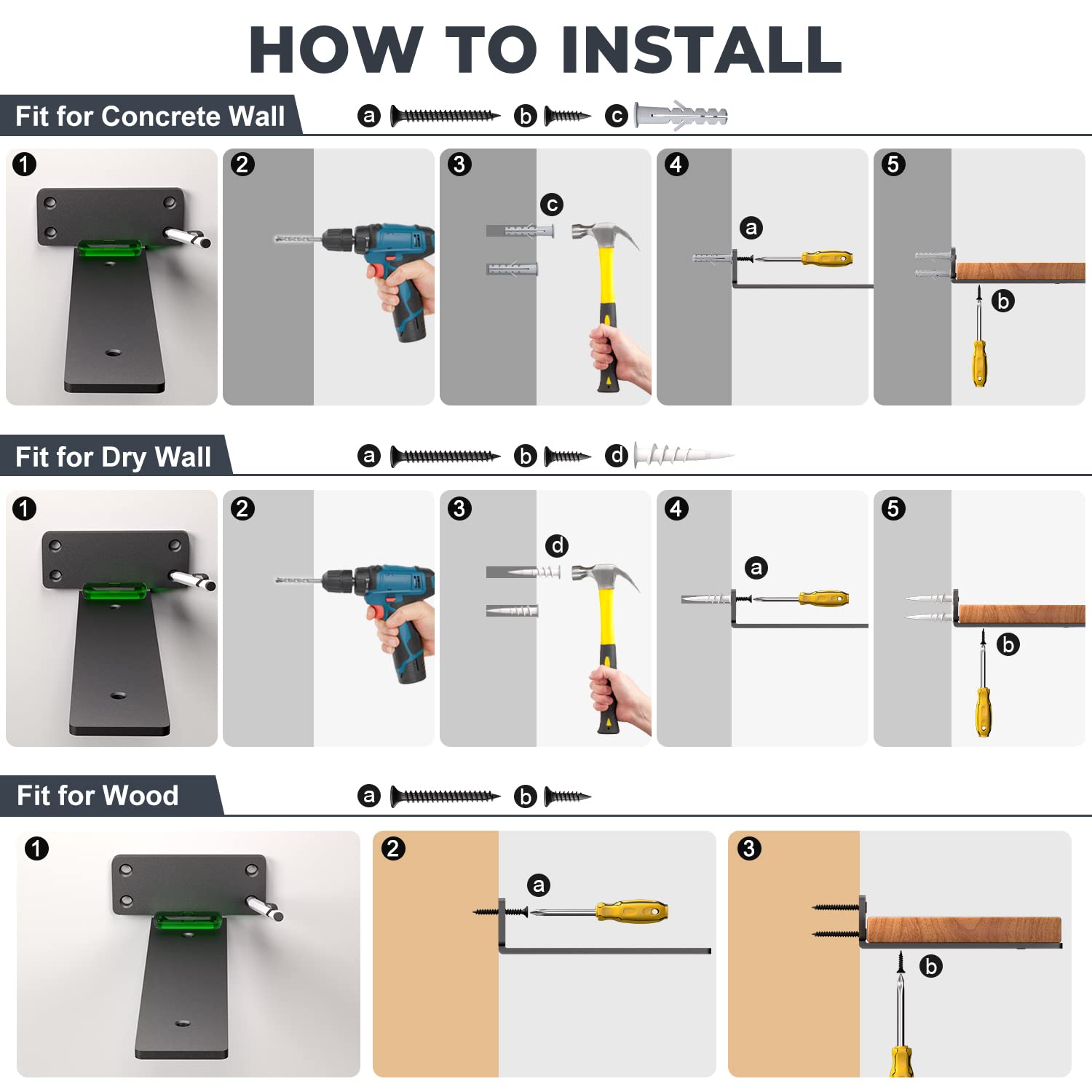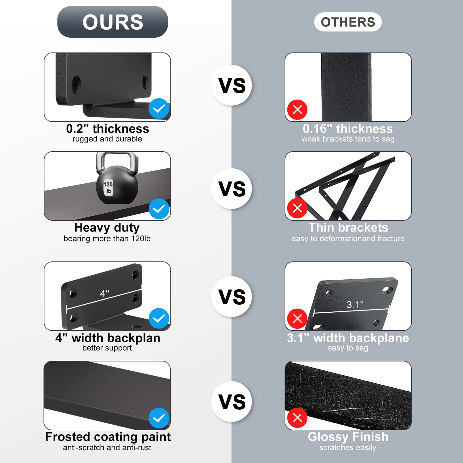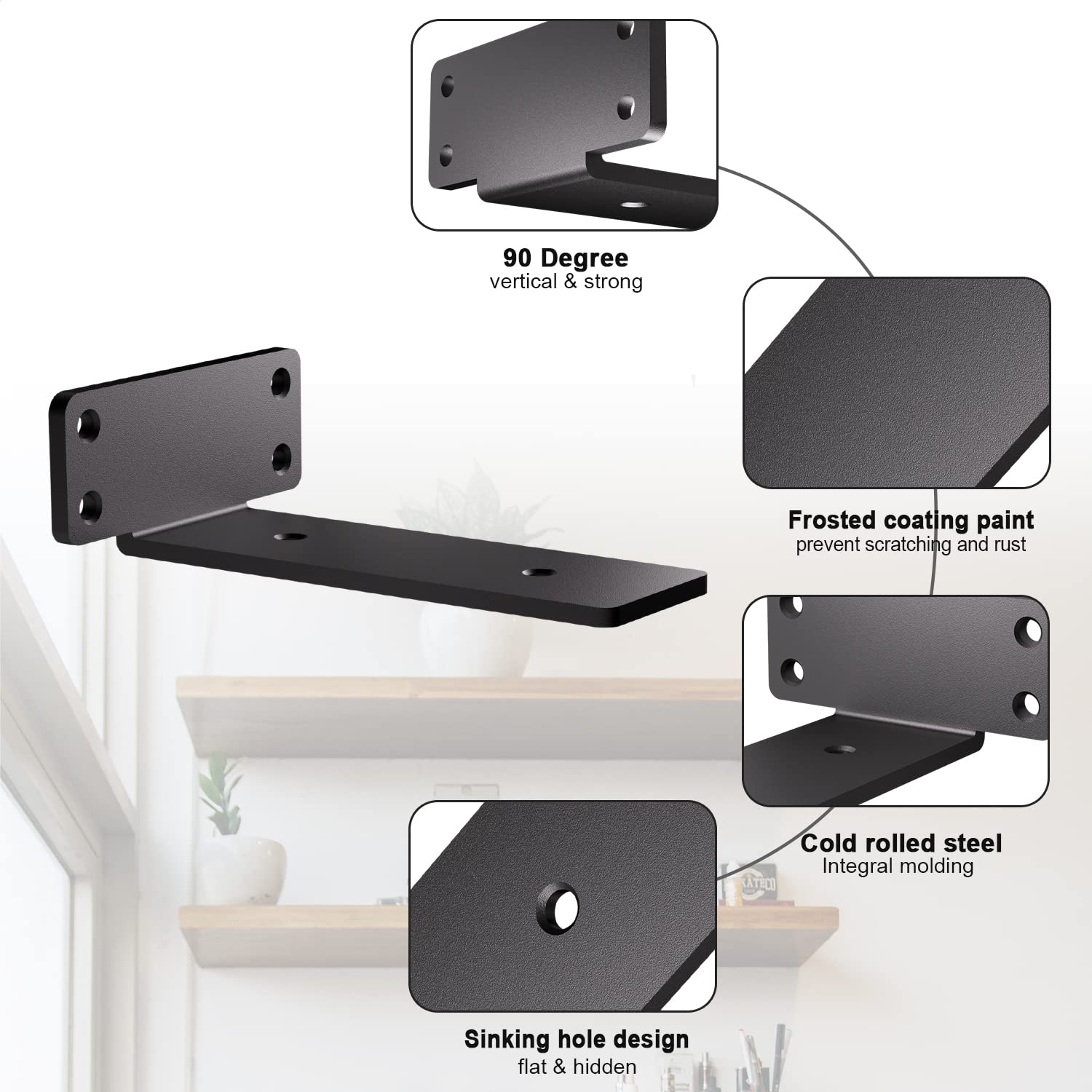 ["Sturdy and Durable Material: The shelf bracket is made of strong and durable solid cast iron, with a thickness of 0.5cm/0.19in. Different sizes of shelf brackets have different weights, the smallest size of each bracket weighs 400g, and the largest size of each bracket weighs 600g. It has good load-bearing capacity and is not easily breakable or collapsible. The surface is painted to effectively prevent rust and corrosion, extending the lifespan.","90° Unibody Molding: The heavy-duty brackets with 90° unibody molding design, unlike segmented welded shelf brackets, unibody molding L shelf brackets can be more load-bearing, but also reduce the tendency for unevenness, so you can be sure to place all the items you want.","Concealed Design: Two types of installation, angle up installation and angle down installation. When you install the black 90° bracket upwards, if the thickness of the plate is up to 4cm/1.6 inches, the bracket can be completely hidden, making your shelf bracket look more neat and beautiful.","Various Sizes: Four sizes of 6 inches, 8 inches, 10 inches, and 12 inches wall shelf brackets are available for your choice. Each set of brackets comes with all the accessories you need, including 6 wall mount brackets, 24 white drywall expansion screws, 24 gray concrete expansion screws, 24 long screws, 12 short screws, and 1 instruction sheet. Easy to use, quick and easy to install. Note: Packages do not include wood boards.","Perfect Support: Widely used in the back of the house, kitchen, garage, office, cafes, restaurants, shops, and other places. Increase space for storage items, make full use of your home space, and keep your home neat and tidy."]
