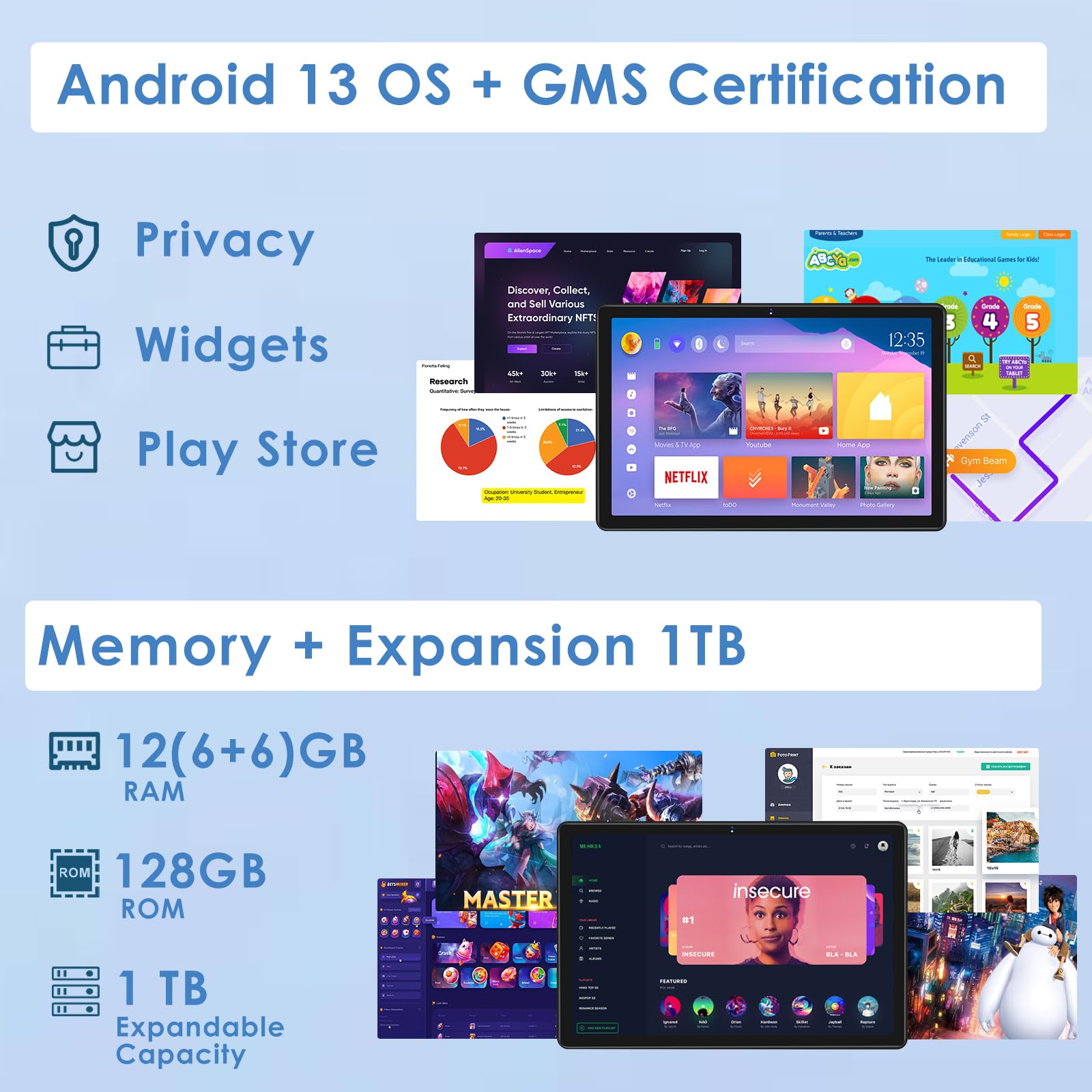 【12GB RAM + 128GB ROM + TF 1TB】Tablet Android 13 features 12 (6+6)GB of RAM for a smooth user experience, whether playing games or opening apps. The tablet has 128GB of built-in storage and can be expanded up to 1TB. For seamless multitasking, you can store a lot of photos, movies, and data without worrying about running out of space.