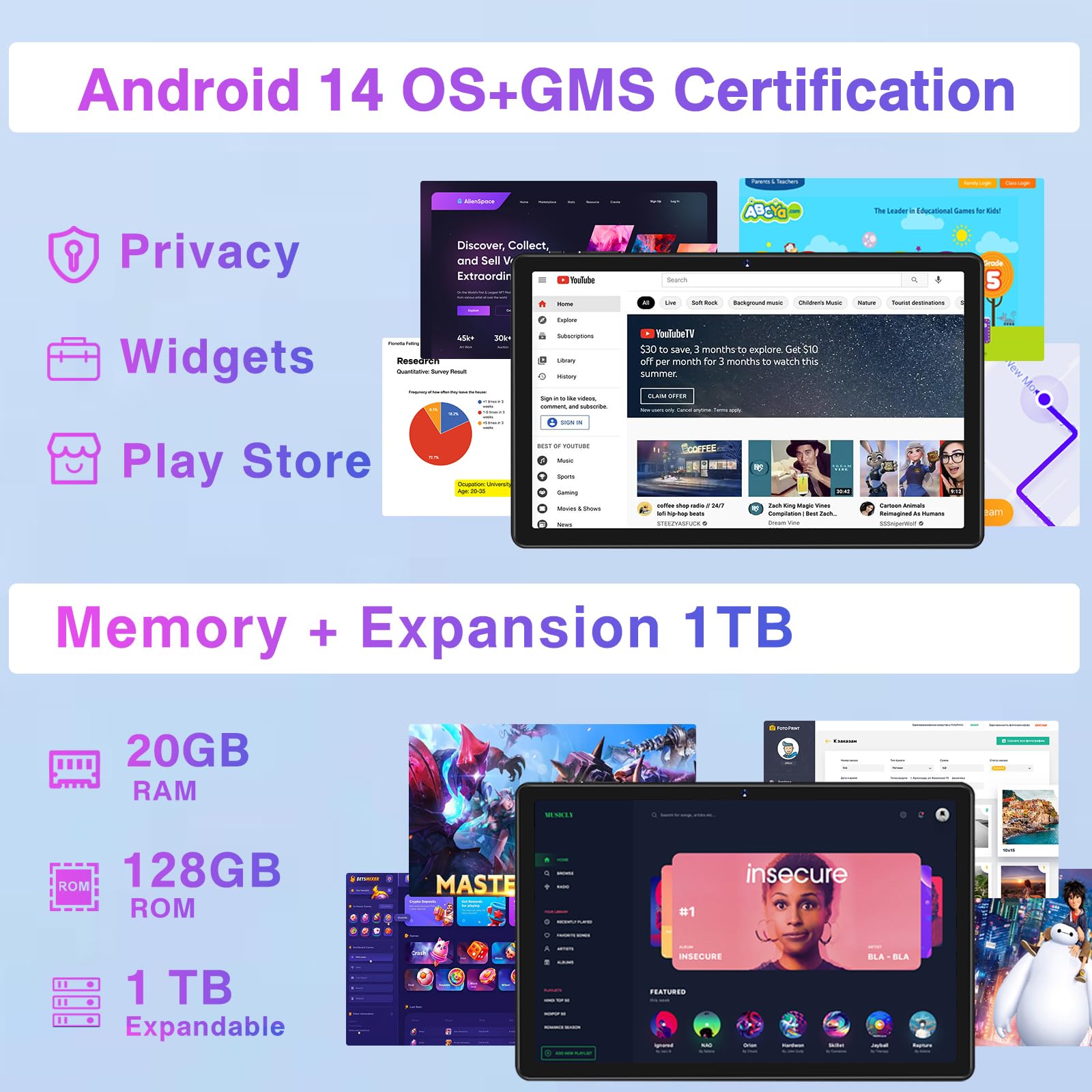 ["【Android 14 + Octa-Core Processor】Tablet Z138 comes equipped with the latest version of the GMS certified Android 14 operating system. In terms of privacy protection, Android 14 is better than Android 13 and enhances user data security. The tablet features a stable Octa-Core processor for excellent performance and a faster operating experience.","【WiFi 6 + BT 5.0 + Widevine L1】10-inch tablet is equipped with the latest WIFI6 technology, supporting 802.11a/b/g/n/ax. WiFi6 covers both 2.4G and 5G WiFi, drastically increasing network performance and speed with faster speeds, greater capacity, and enhanced security. Bluetooth 5.0 ensures easy connectivity with other Bluetooth devices. With Widevine L1 certification, this tablet supports high resolutions across platforms and smoother video streaming for an ideal viewing experience.","【20GB RAM + 128GB ROM + 1TB Expandable Storage】Tablet Android 14 comes with 20(6+14)GB RAM + 128GB ROM, supporting up to 1TB expandable storage for ample space to edit and store your work and study files for fast, lag-free multitasking. You can also install apps from the Play Store to facilitate work, study, reading, or movie watching on your tablet.","【6000 mAh and 5MP + 8MP Camera and Split Screen】Tablet features two cameras (5MP front and 8MP rear) for photography and video chats. The 6000 mAh battery has energy management functionality to reduce unnecessary power consumption. The tablet also has a split-screen function allowing you to display two apps simultaneously on the screen.","Note: On the top of the Z138 tablet package, the blue tablet pattern is uniformly printed. The color of the actual tablet in the box corresponds to the color of the tablet you purchased, please feel free to buy, thank you!"]