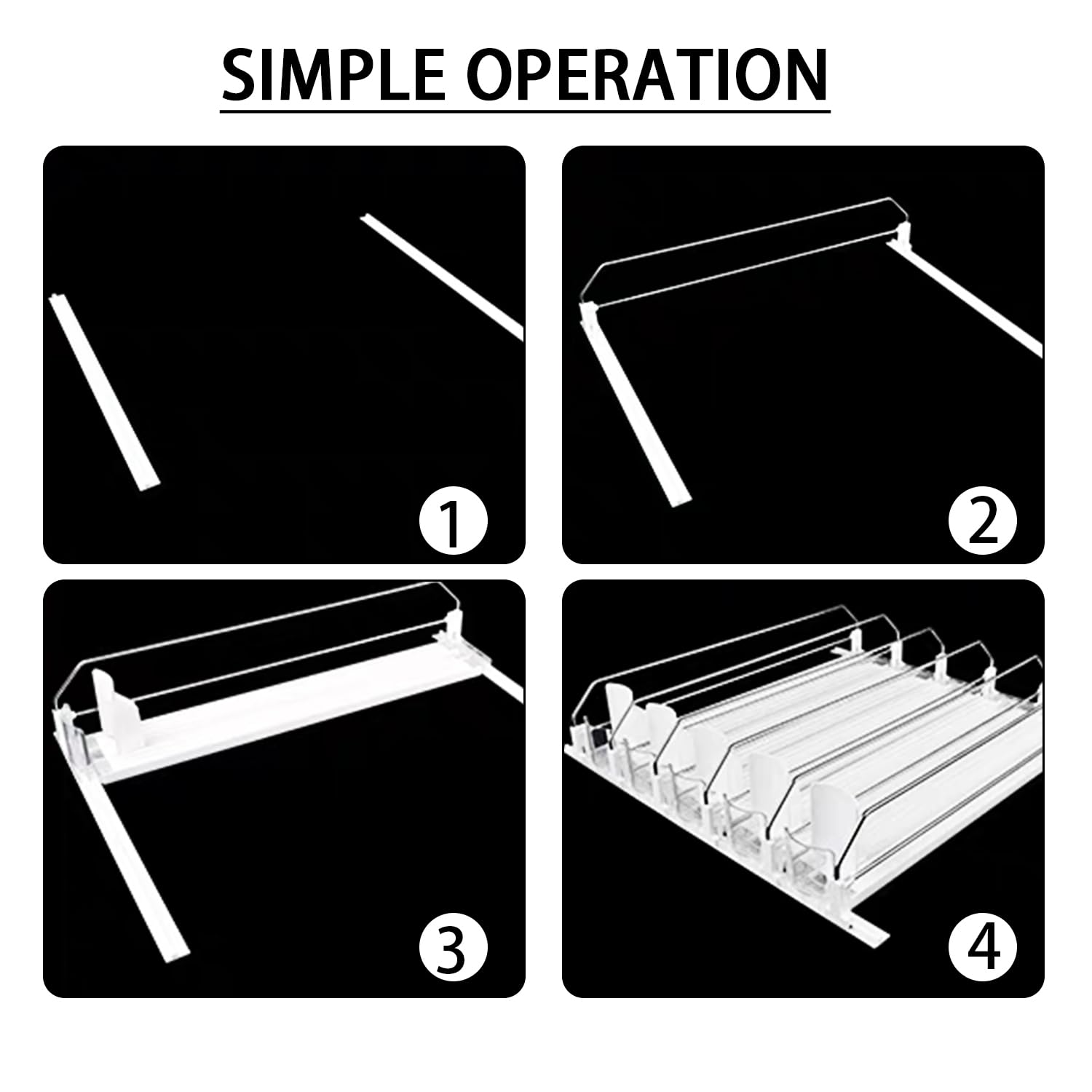 ["🥤 Package Contents: Drink organizer, you will receive 2 mounting rods, 5 sliding rails, 6 partitions. The installed size is approximately 16.6*12.2*3.15 inches.","🥤 Easy Installation: This fridge drink organizer is easy to assemble, simply push the drink pushers and the sound wall into the front and back rails, the fridge slider can always keep the beverage cans in the front position, making it easy to take out the drink anytime.","🥤 Product Design: The fridge organizer adopts the design of roller balls and the force spring, the spring-loaded slider automatically and smoothly slides your drinks forward, making it more convenient to quickly put drinks in and out. The product can be adjusted and disassembled for easy cleaning.","🥤 Material: Drink organizer is made of iron, the surface is smooth and does not hurt the hands, durable. Each pusher has two metal springs, no rust, strong and durable. Strong adhesive on the bottom can be fixed well.","🥤 Widely Used: Can organizer for fridge, freezer, kitchen, pantry, cabinets, office, shelves, retail stores."]
