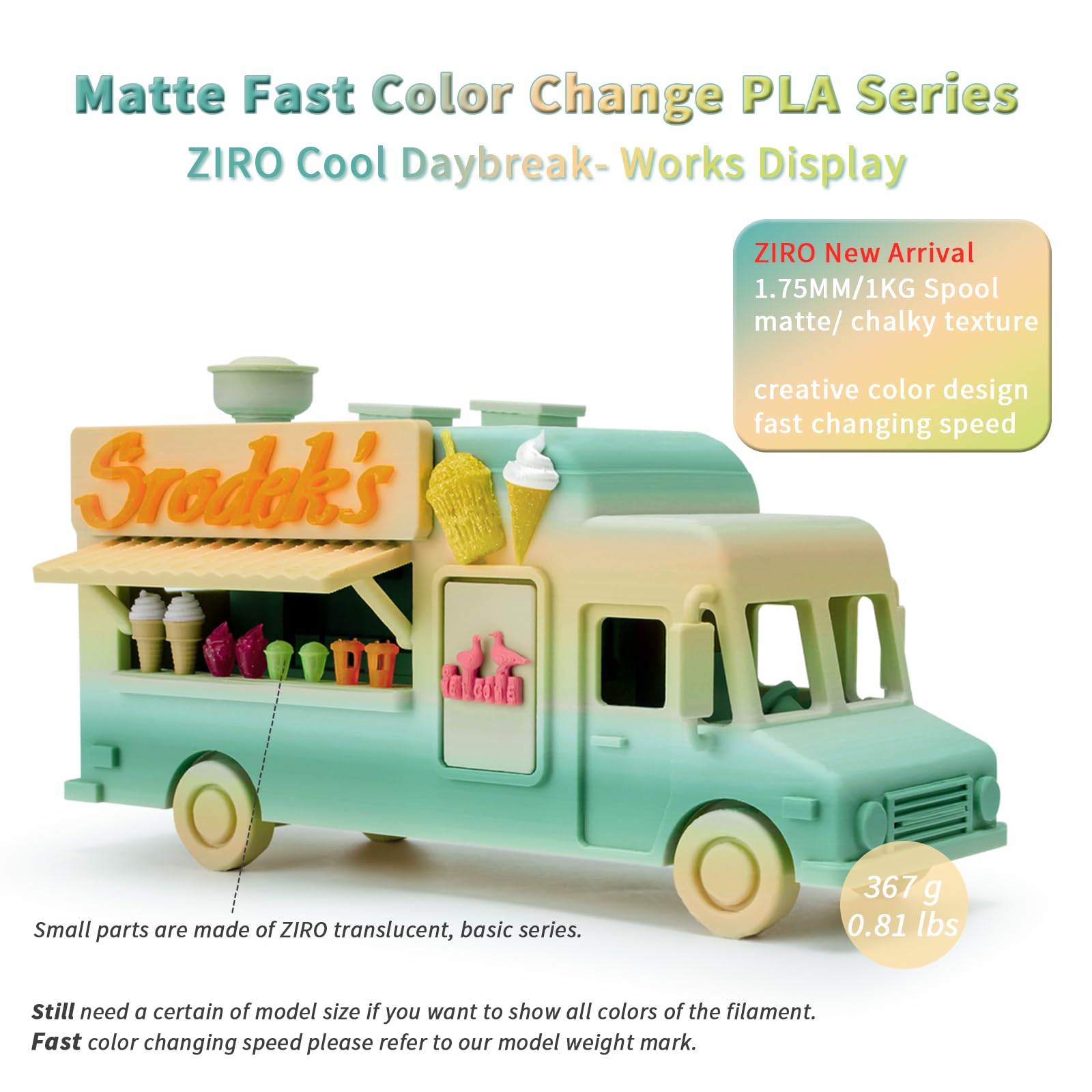 "【Fast Color Change Matte PLA】ZIRO "Cool Dawn" combines multiple colors in a matte PLA filament. Advanced production technology to achieve truly faster color change goal. The matte surface provides a No-Shine look and gives your 3D works a unique style"