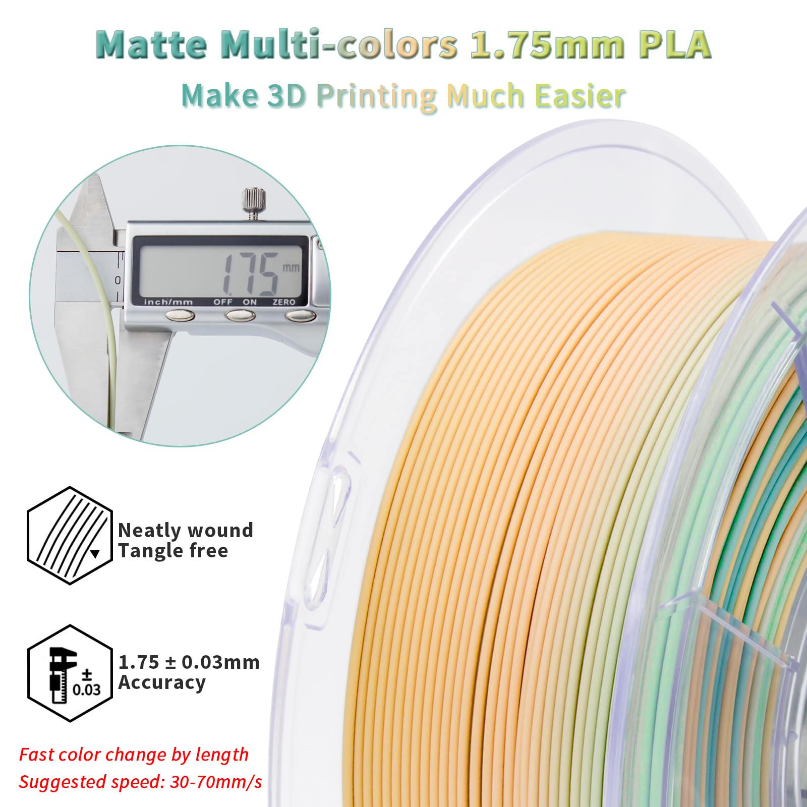 ZIRO Matt Multicolor PLA Filament 1.75mm, Fast Color Changing Matte 3D Printer Filament, 1kg Spool for Most FDM 3D Printers, Dimensional Accuracy +/-0.03mm, Cool Dawn.