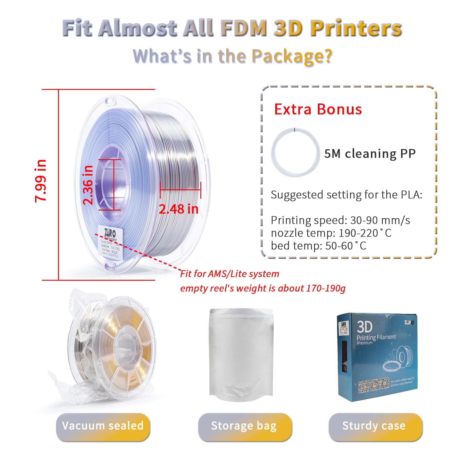 "【High Compatibility】ZIRO Silk filament 1.75mm is an easy-to-print material compatible with most common FDM 3D printers. Recommended extrusion/nozzle temperature 190-220°C, heat bed 50-70°C, printing speed 30-70mm/s",