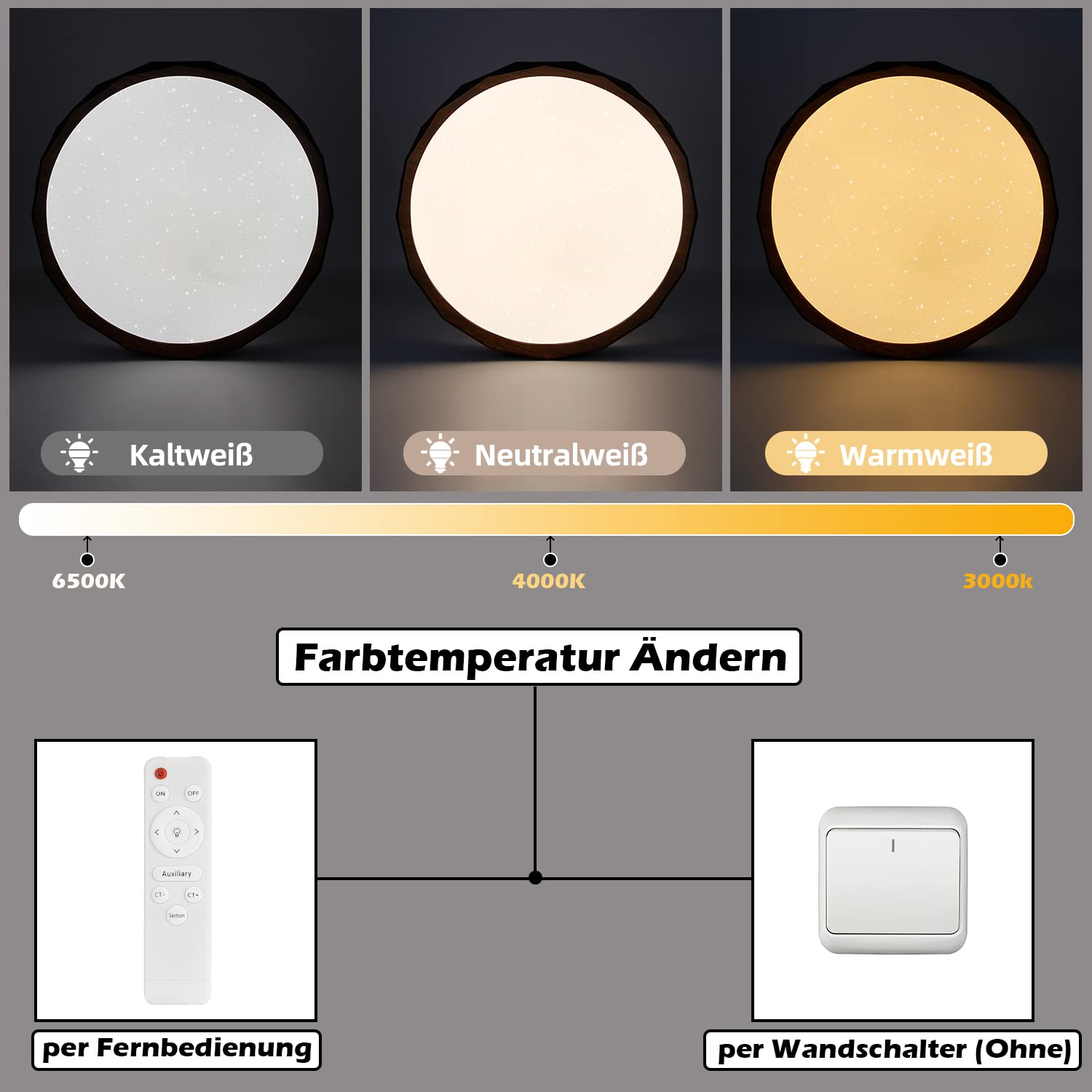 "Ceiling lamp with adjustable color temperature: This LED ceiling light offers 3 color temperature options: 3000 K-warm white for a cozy atmosphere while watching TV and eating, 4000 K-neutral white to improve color reproduction of objects and suitable for all weather conditions, and 6500K-cool white, ideal for summer and helping you stay more focused during work."