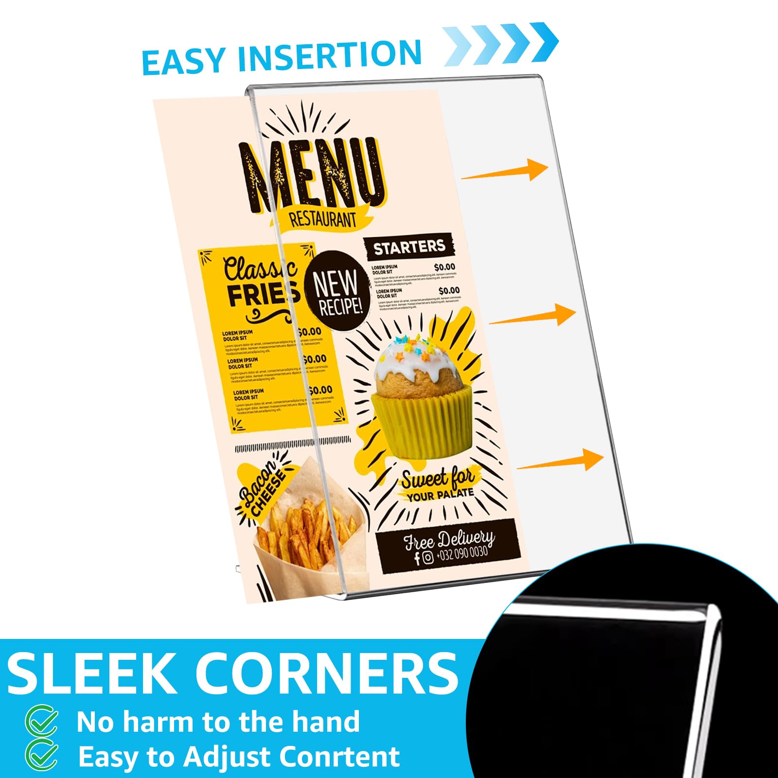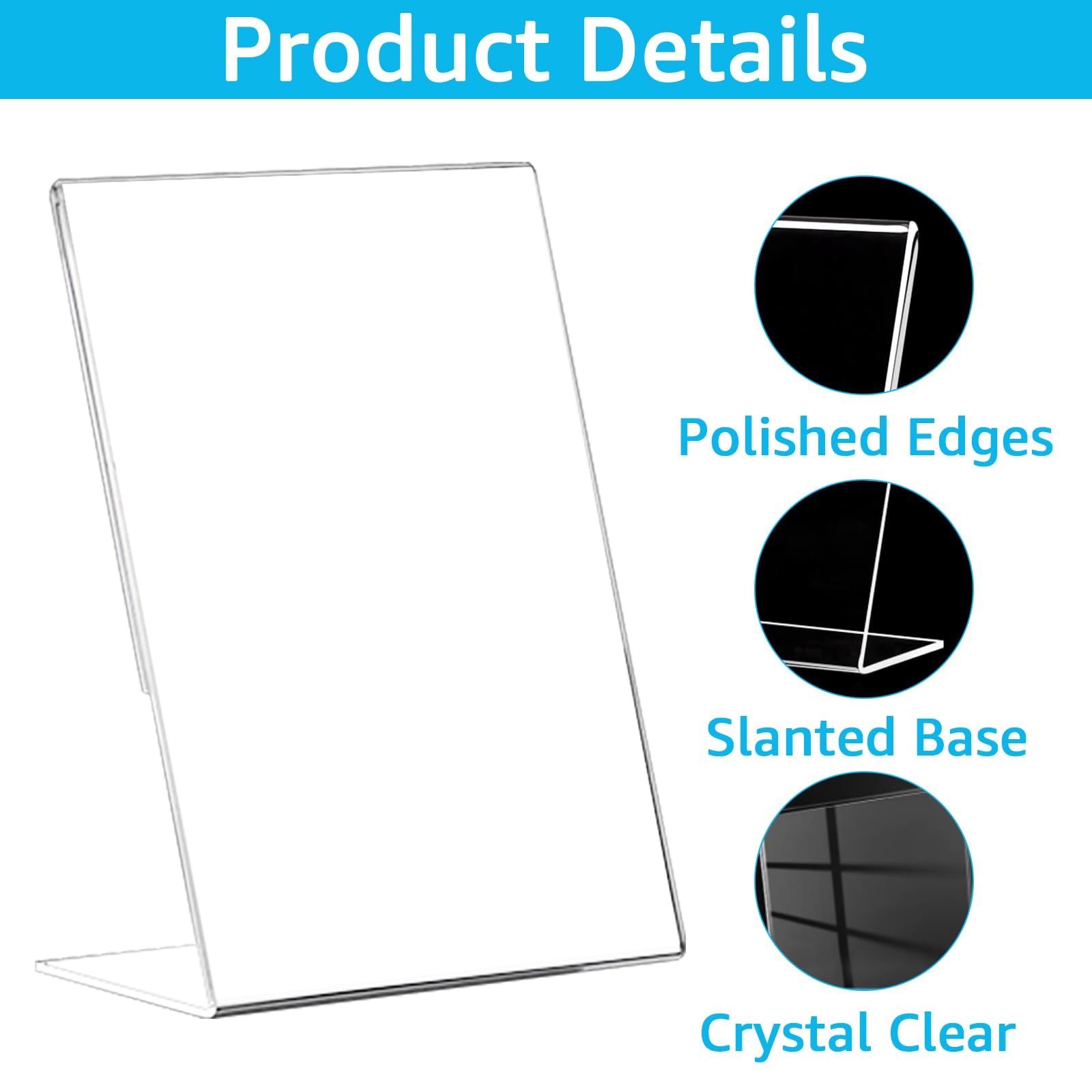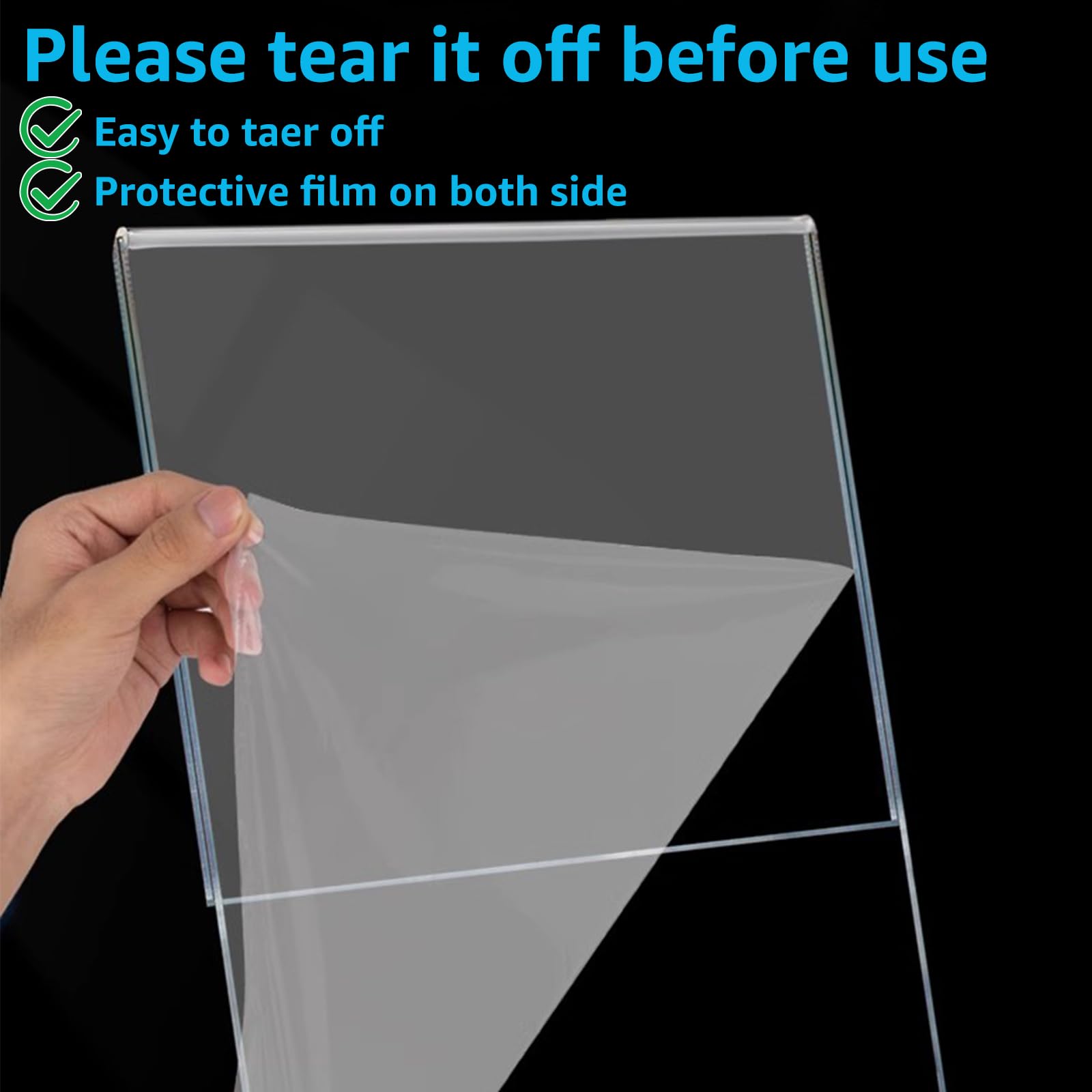 ["【Good Quality】A4 stand made of high-quality, clear acrylic. This transparent sign holder has excellent durability and elasticity. Acrylic is an unbreakable material that is strong and scratch-resistant despite its light weight.","【L-Design】A4 table stand with a wide flat base allows independent vertical display inserts and keeps the device stable on the table: tilt angle (L-shaped), clearly visible when standing. It shows what you see at a good angle and is more stable and less prone to falling.","【Side Opening and Easy Insertion】Acrylic stand A4, clear and durable (Note: There is a protective film on each screen, please remove it before use). Each A4 acrylic stand has an opening on one side for easy card insertion. No screws, no drilling, no tools.","【Package Includes】The package includes 10 packs of A4 acrylic sign holders, DIN A4/Width: 8.27 inches, Height: 11.69 inches. This table sign holder protects and displays your sign/poster for a long time, protecting them from stains, scratches, and tears.","【Widely Used】The A4 stand clearly displays food cards and flyers that can attract the attention of more people. Suitable for home, office, school, restaurant, hospital, church, hotel, trade show, wedding party, etc."]