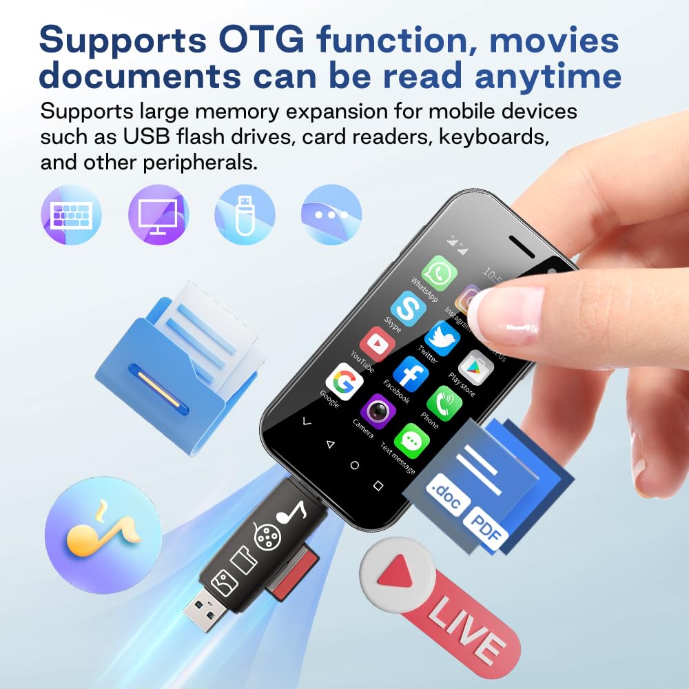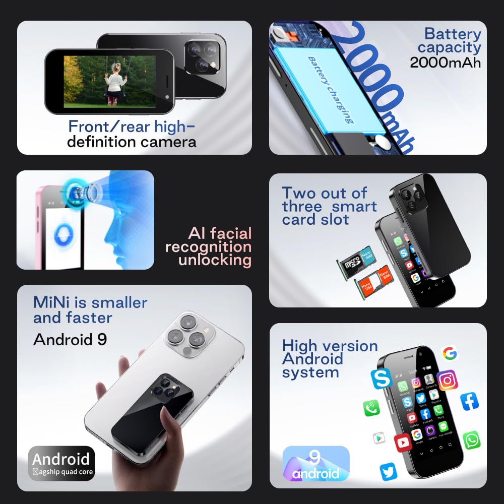 ["Children's phone: The ultra small, ultra light 3-inch display, the exquisite exterior design, the compact body with dimensions of 94*47.4*12.5 mm and a weight of 84 grams make the Zokoe XS14Pro a masterpiece in terms of appearance and feel.", "Basic parameters: Android 9, MT6739CW / Quad-Core, 1.28 GHz resolution: 480*854 TFT, 2000 mAh battery, 200W+500 camera, 3 GB RAM, 64 GB ROM.", "Basic functions: Bluetooth, FM, WLAN, Face Unlock, OTG, GPS navigation. It also supports simultaneous insertion of 2 cards (Nano-SIM + Nano-SIM / 1 TF card) and provides additional storage of 128 GB via a TF card for more music, videos, and apps.", "Compatible apps: This unlocked phone is compatible with most apps in the Google Play Store, including Facebook, Youtube, Instagram, WhatsApp, Tiktok, Twitter, Google Maps, and much more!", "4G band: 850/900/1800/1900, WCDMA: B1/B5/B8, FDD: B1/B3/B5/B7/B8/B20/B28/B28A, TDD: B34/B38/B39/B40/B41."]