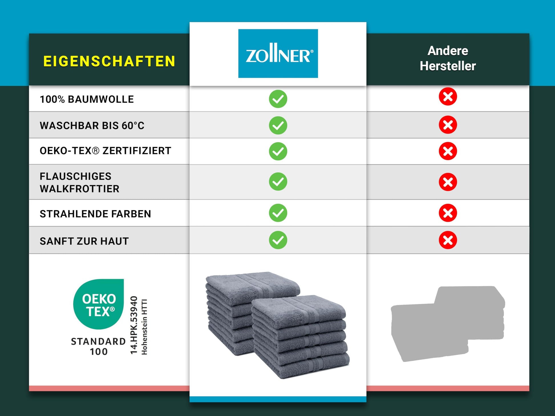 ["VERSATILE USE - Whether as a bath towel for home, travel towel, or gym towel for the fitness center - towels are absolutely indispensable. Thanks to the 10-pack, you are perfectly equipped for the week.","HOTEL QUALITY - ZOLLNER hotel and gastronomy linen is more than just textiles - it is the heart of comfort and elegance, felt by guests. With each item, we create unforgettable moments that touch hearts.","HIGH-QUALITY MATERIAL - The small bath towel is a practical 50 x 100 cm, just right for the sports bag. It is made of 100% cotton, which has been processed into absorbent, soft terry fabric, and has a material weight of 450 gsm.","EASY CARE - For hygienic cleanliness, the bath towels are washable at 60°C and suitable for the dryer. The towel has a discreet striped border and a loop for hanging.","QUALITY PROMISE - Quality and safety are particularly important to the ZOLLNER brand, which is why these cotton towels have been tested for harmful substances and certified according to STANDARD 100 by OEKO-TEX (R), test number 14.HPK.53940.","WANT EVEN MORE? Discover the variety of ZOLLNER! Click on the brand store above to explore all ZOLLNER products, from bathroom, kitchen, and living room textiles to bedroom and household goods."]