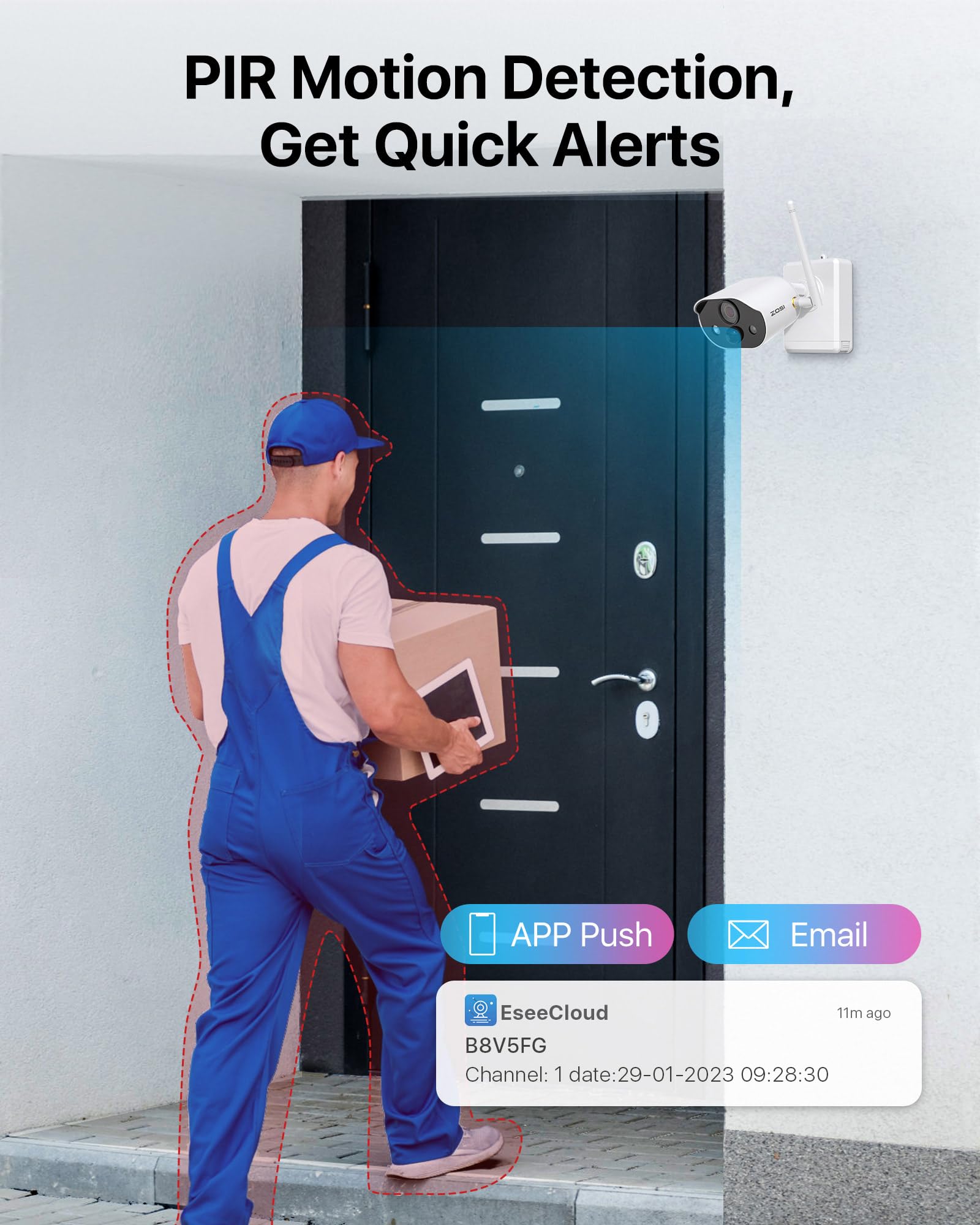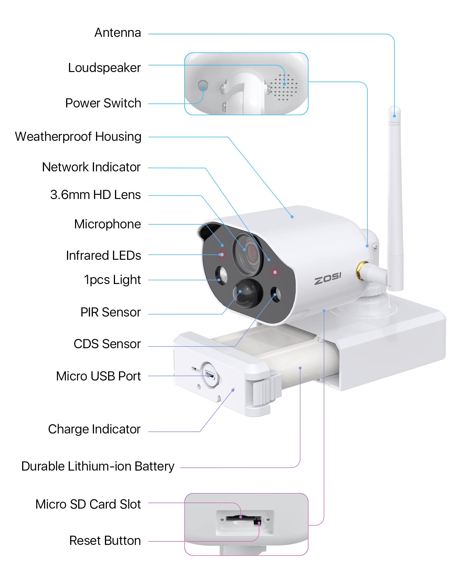 ["【100% wire-free surveillance camera system】- Rechargeable battery and WiFi connection make this system 100% wire-free. No power cables and no wiring required. You can place it anywhere, indoors or outdoors, keep an eye on your home or business.","【2K resolution with color night vision】These outdoor wireless surveillance cameras deliver clear and sharp 2K video resolution, ensuring better video quality with more details. The spotlights provide color night vision so you can see videos in color even at night.","【Rechargeable battery】These ZOSI C309 wireless surveillance cameras are powered by the built-in batteries. An additional battery is also included so you can replace the battery without having to take the surveillance camera out of operation. (Tips: FULLY CHARGE it when using it for the first time).","【Weatherproof with two-way audio】The battery-operated ZOSI C309 surveillance camera is suitable for outdoor use in any weather thanks to its robust IP66 design. With built-in microphone and speaker, you can clearly hear and speak through the app. Note: Compatible app is "Eseecloud"; NO support for "ZOSI Smart".","【PIR motion detection and remote access】The sensitive PIR motion sensor detects people and sends you instant app push and email notifications. Configure motion sensitivity and working hours flexibly to avoid false alarms caused by moths or branches."]