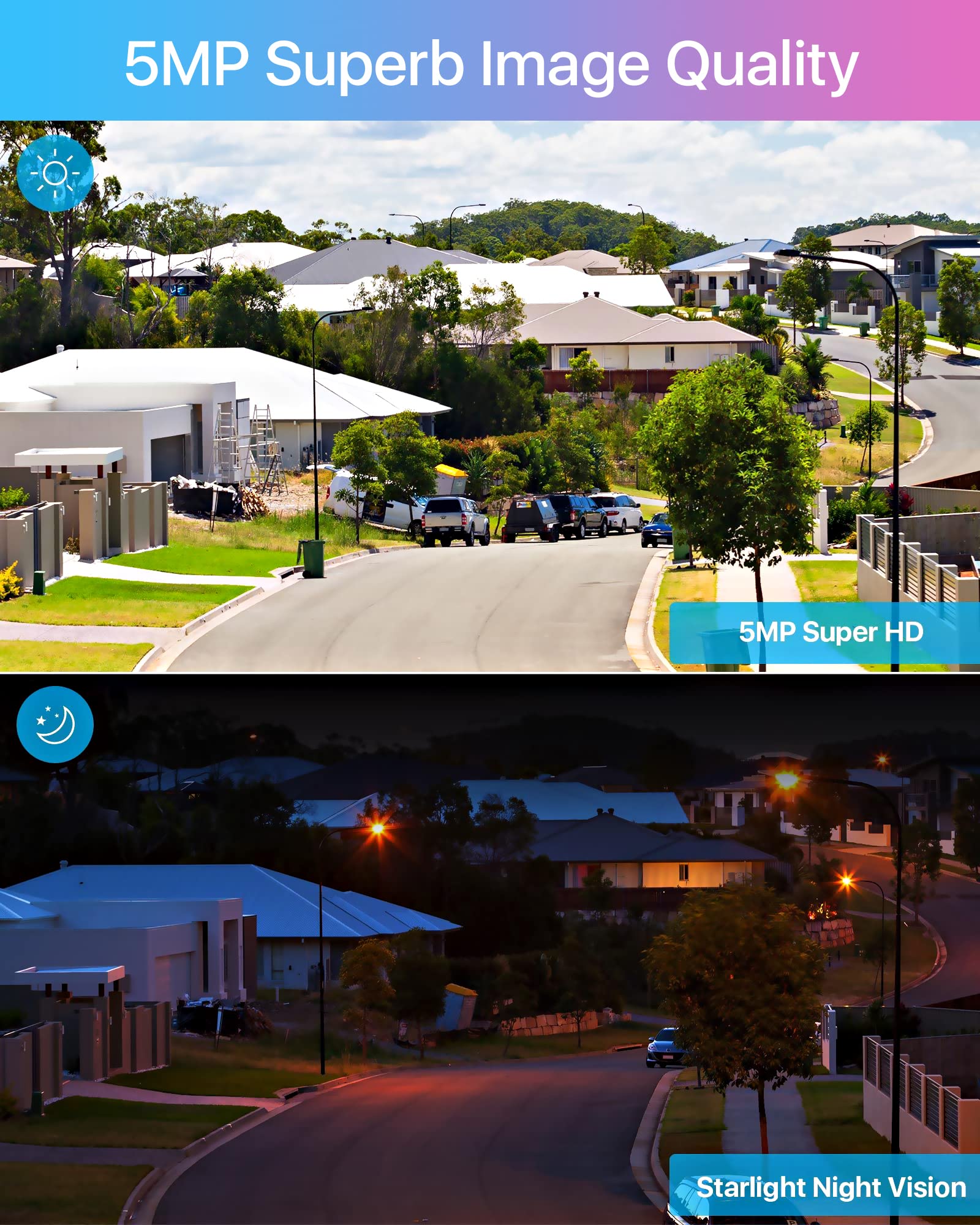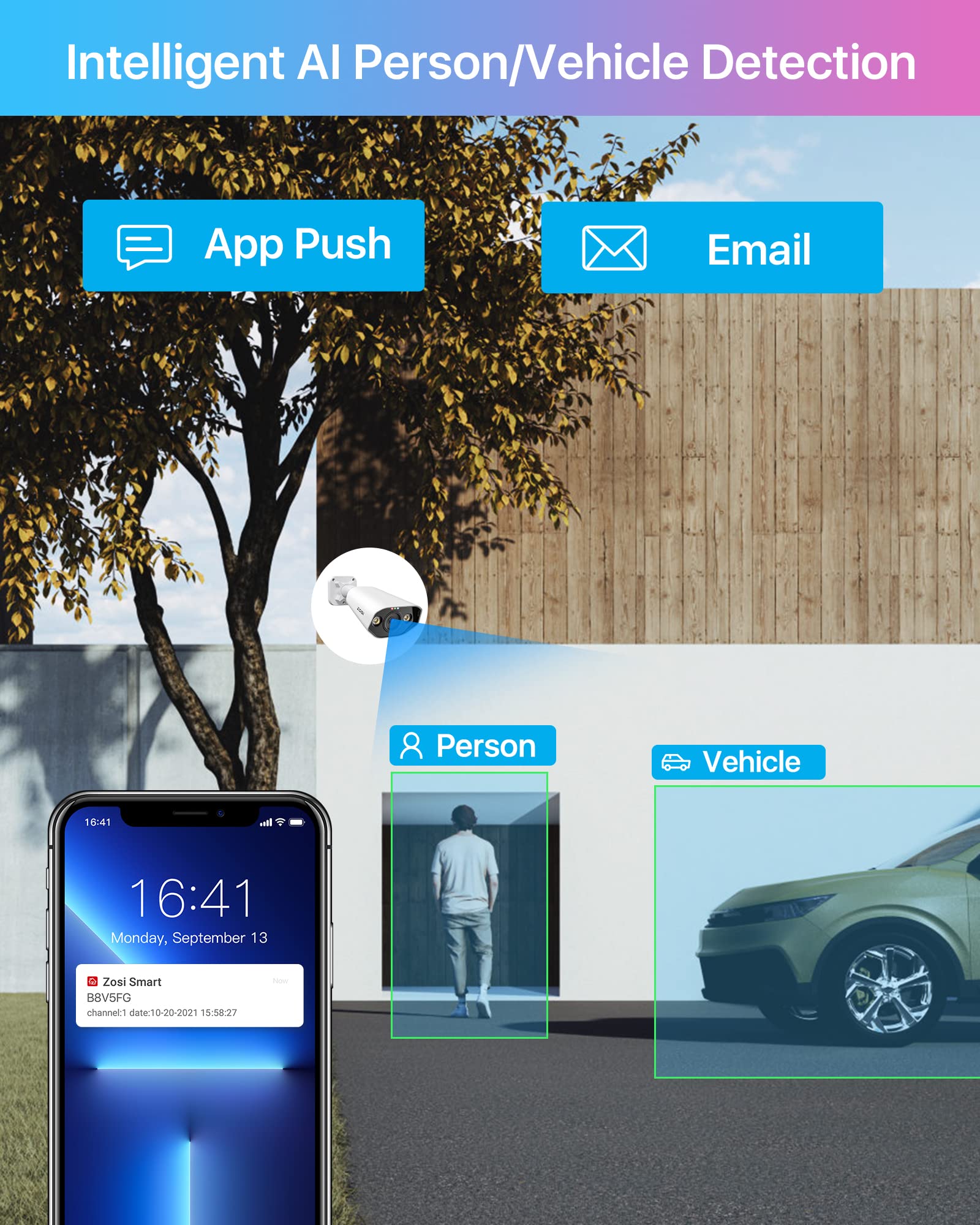 ["【Super HD 5MP Camera Surveillance Outdoor Set】3K Super HD resolution and color night vision help you see every detail. The weatherproof IP66 metal housing makes the PoE security camera system suitable for both indoor and outdoor use.","【Intelligent Sound and Light Alarm】Using AI algorithm, this camera video surveillance system can accurately identify people and trigger the built-in siren and spotlight to scare off intruders. You will receive real-time push notifications and email alerts so you can take immediate action and deter unwanted visitors with 2-way audio.","【Two-Way Audio】Thanks to the built-in microphone and speaker, the camera can now speak in both directions, for communication with your family and for deterrence.","【Expandable NVR with 4TB Hard Drive】- With the 16-channel PoE Nvr, you can add 8 additional Zosi cameras. With a built-in 4TB hard drive, the CCTV system supports continuous 24/7 audio and video recording of all cameras.","【Stable Plug-and-Play PoE System】This bullet camera security system features PoE technology (Power over Ethernet). Only one network cable is required to ensure both power supply and data transmission."]
