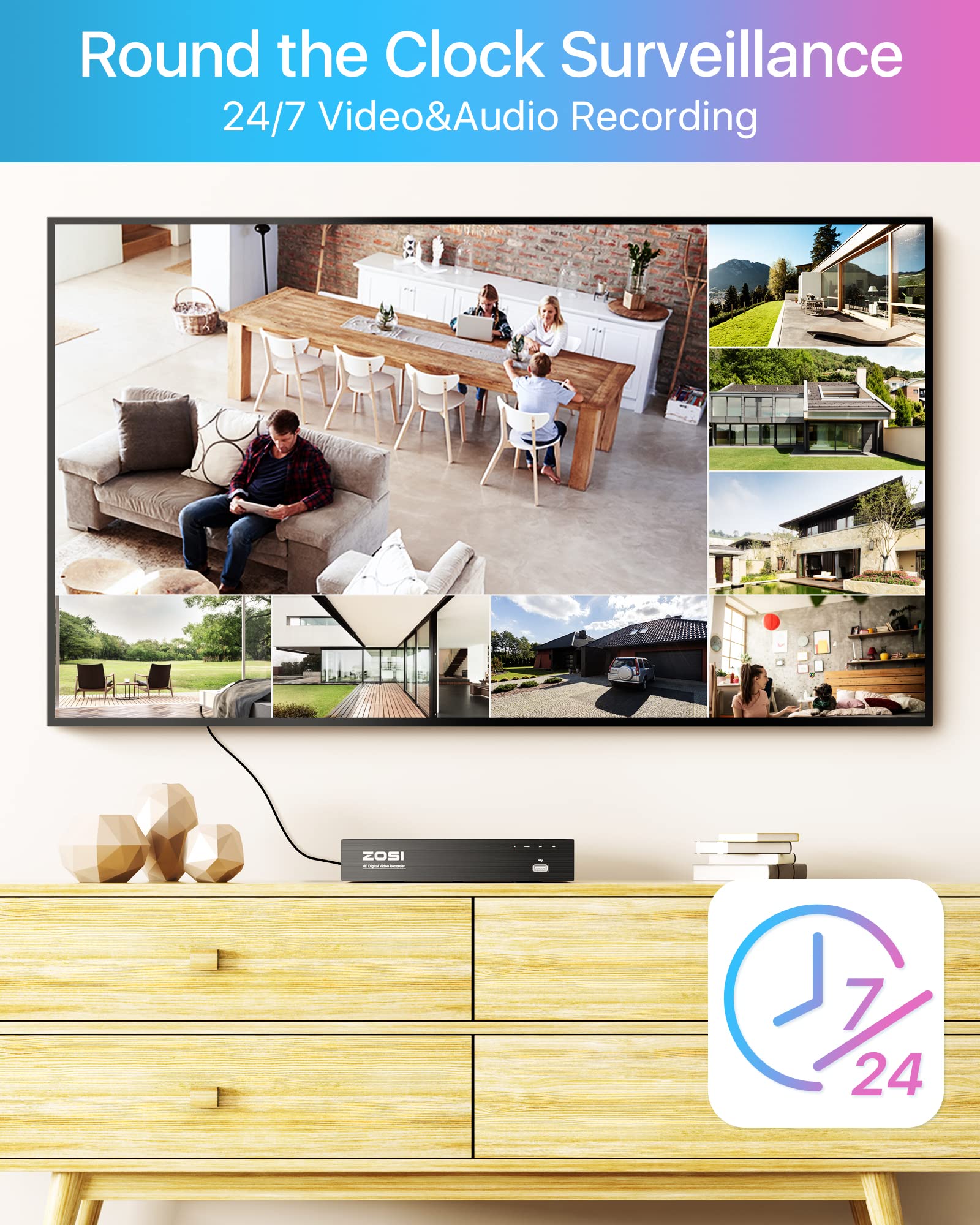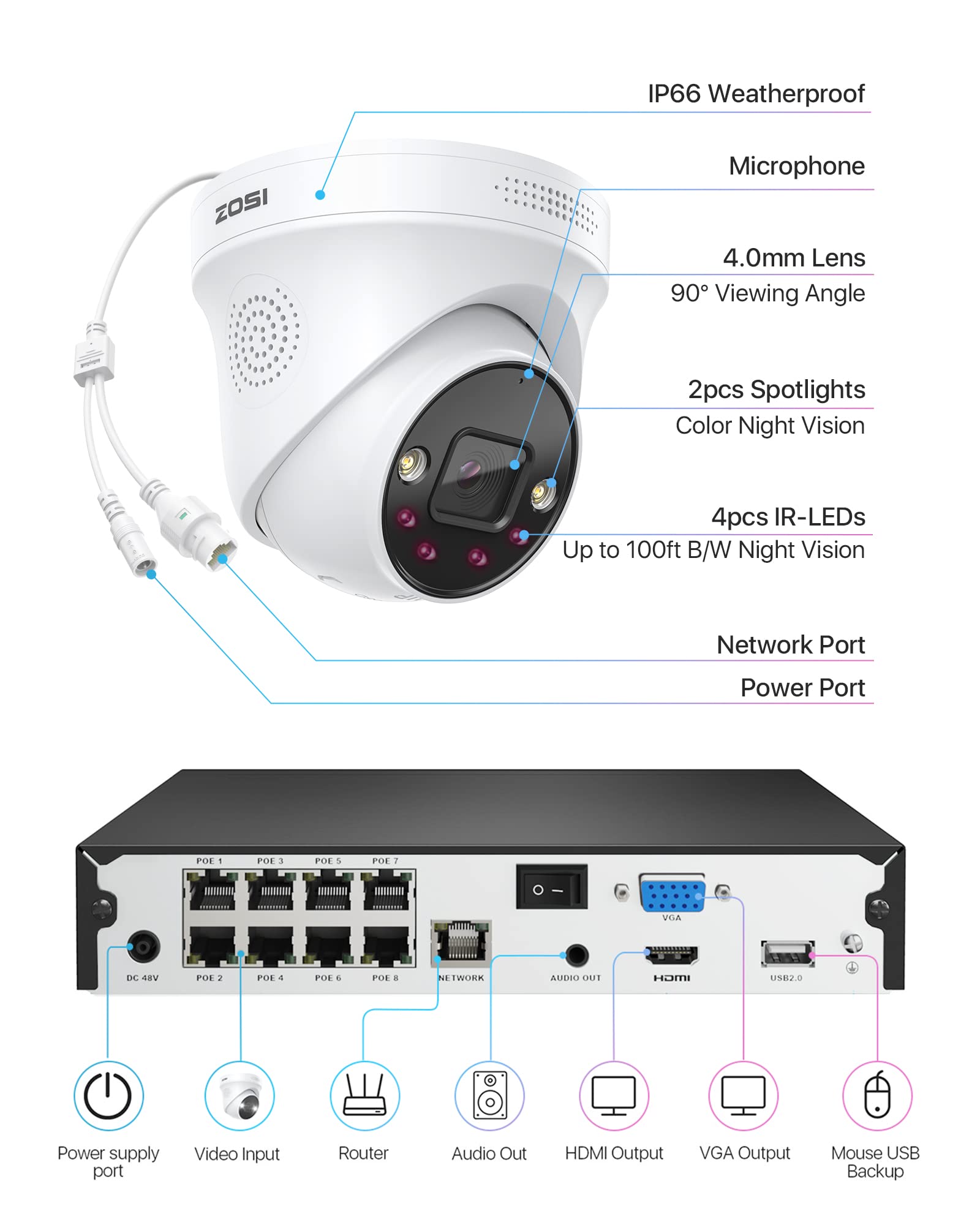 ["(1) Intelligent detection and sound & light alarm: Using advanced AI algorithms, this dome IP surveillance camera can better recognize people and vehicles, thereby reducing false alarms. When an intruder is detected, the surveillance system automatically triggers the alarm sound and lights.","(2) Real-time conversation: Thanks to the built-in microphone and speakers, you can communicate with anyone in front of the security camera or deter potential criminals from the Zosi Smart App.","(3) 5MP Super HD for more visual details: Each surveillance camera in this video surveillance kit records videos at a resolution of 2560x1920, up to 5 times better video quality compared to 720p. The 2 spotlights support color night vision even in darkness.","(4) 24/7 recording of audio and video: This video surveillance kit supports continuous recording, and all important moments are stored on the pre-installed 2TB hard drive. Optional recording based on motion and schedule.","(5) Easy installation with PoE technology: This PoE camera outdoor surveillance kit uses a single network cable for transmitting video signal and power. Save money and time on laying a separate power cable."]