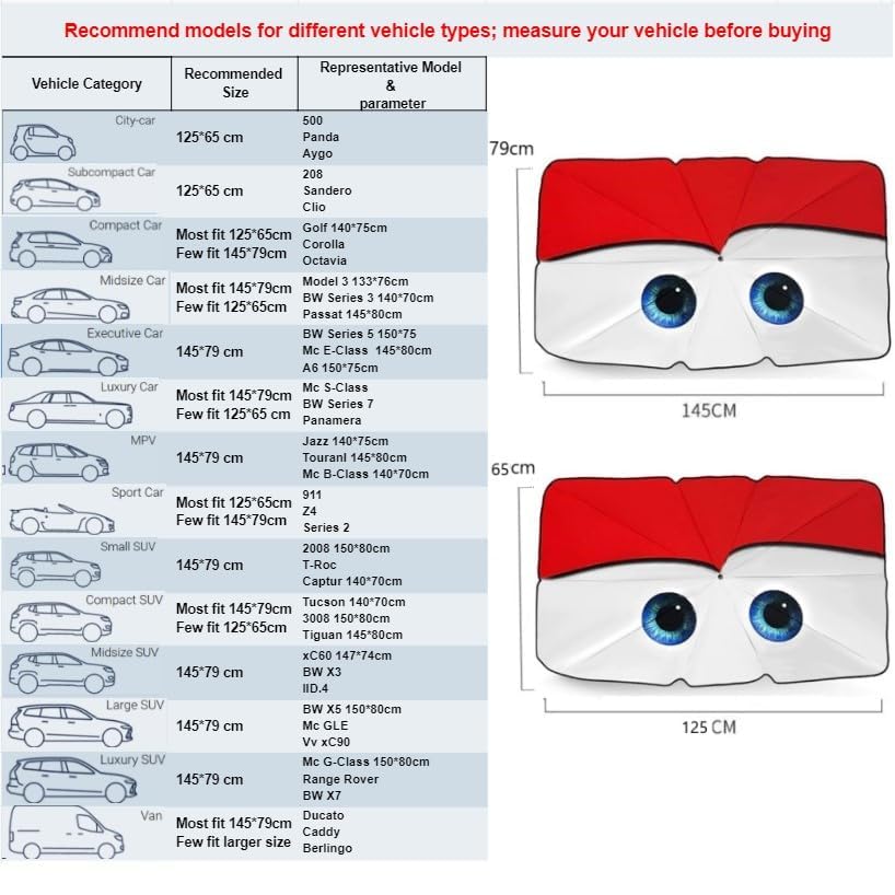 "Fits most compact cars: The car windshield sunshade measures 125 cm x 65 cm for maximum coverage of your windshield. Suitable for compact cars, sports cars, and some sedans. Please confirm the size before purchasing.