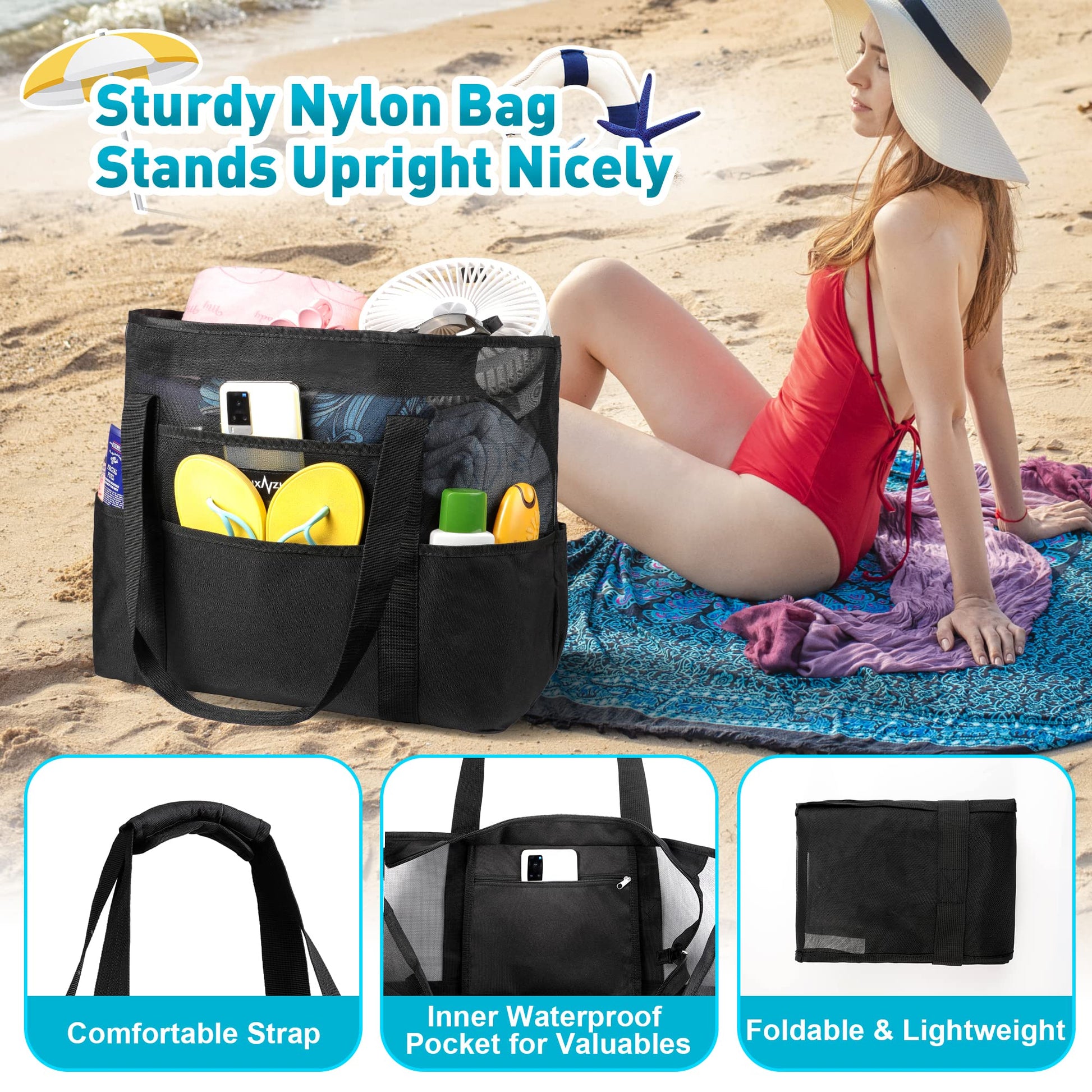 "【Versatile for Outdoor Activities】 Whether beach vacation, camping, sports events or shopping – this zippered beach bag is your reliable companion. The encrypted mesh structure provides security for valuables, while the lightweight design ensures maximum flexibility.",